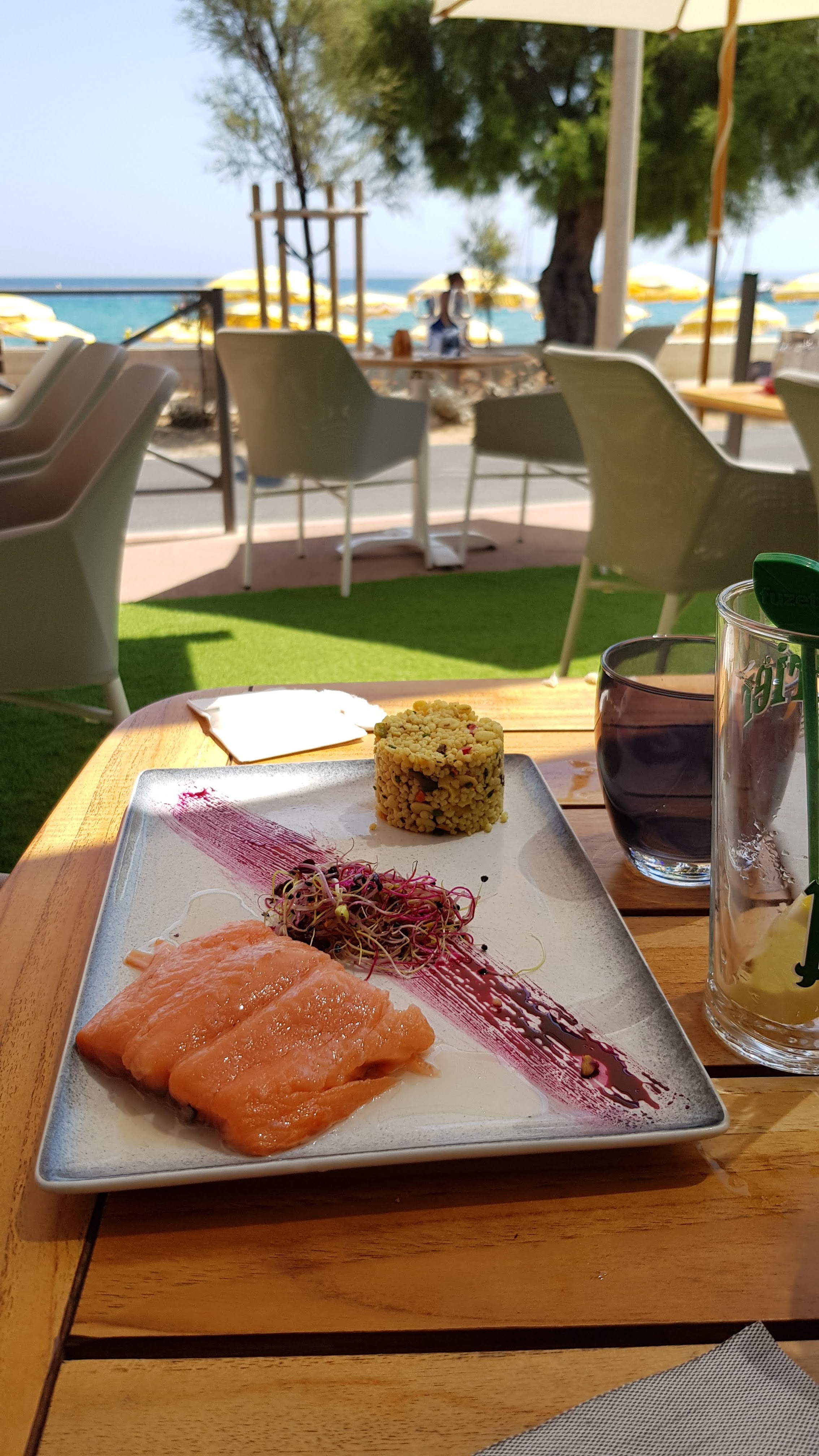 Ce restaurant très agréable et lumineux avec sa terrasse très tranquille et sa cuisine délicieuse vous pouvez déguster du poisson succulent.Le personnel de cet établissement est très efficace souriant accueillant . Les desserts sont parfaits et le café est divin. Je vous recommande cet havre de paix où vous pourrez déjeuner face à la mer.