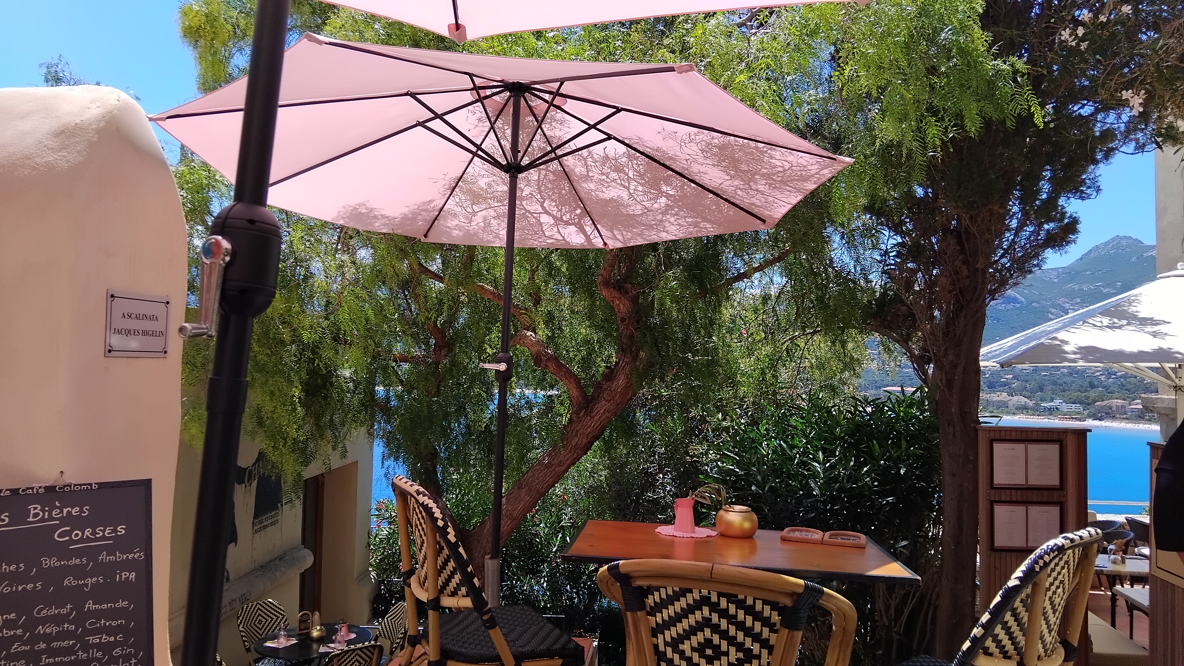 Restaurant exceptionnel. La vue sur le port et la mer à travers les arbres est époustouflante. Le café était très bon, le service était très attentionné. Dès qu'un invité était assis au soleil, un parasol était déplacé ou installé. Remarquable. Vous devriez absolument visiter lorsque vous êtes à Calvi.