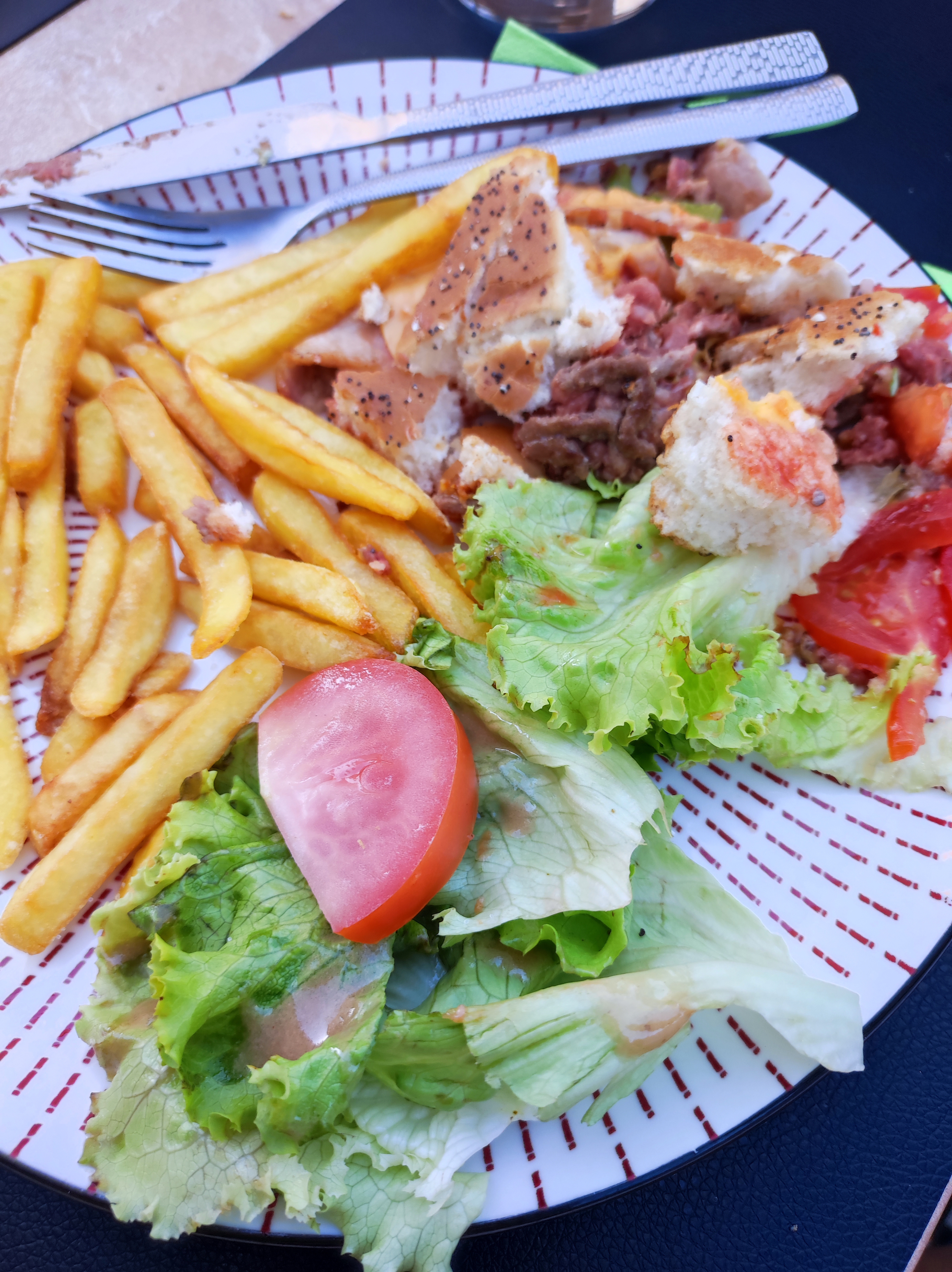 Nous avons choisi ce restaurant car bien noté. Arrivés sur place, nous n'avons pas compris cette note. Regardez par vous même. Une salade et un menu enfant avec des nuggets durs, trop cuits du supermarché. Un tartare avec un assaisonnement immonde. Un burger de boeuf trop cuit, pain dur. Et quand vous évoquez votre déception au serveur, il vous envoie sur les roses! Bref, plus de 60 euros pour un repas type lidl a moins de 10 euros! Passez votre chemin, cela ne peut pas être pire que