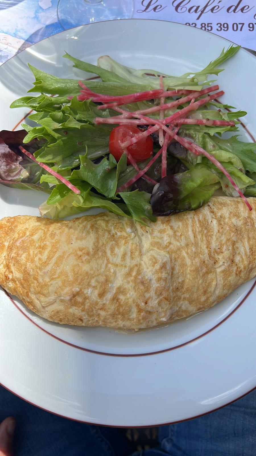 Restaurant qui ne paye pas de mine, super bien placé face à l'abbaye St Philibert. On a mangé en terrasse, l'omelette était cuite à la perfection. Pour ma part je suis végan et même s'il n'y avait rien de prévu pour moi, le serveur m'a fait des assiettes et crudités et une ratatouille maison avec des frites maison. Personnel chaleureux et le tout pour un prix honnête. À recommander 👍