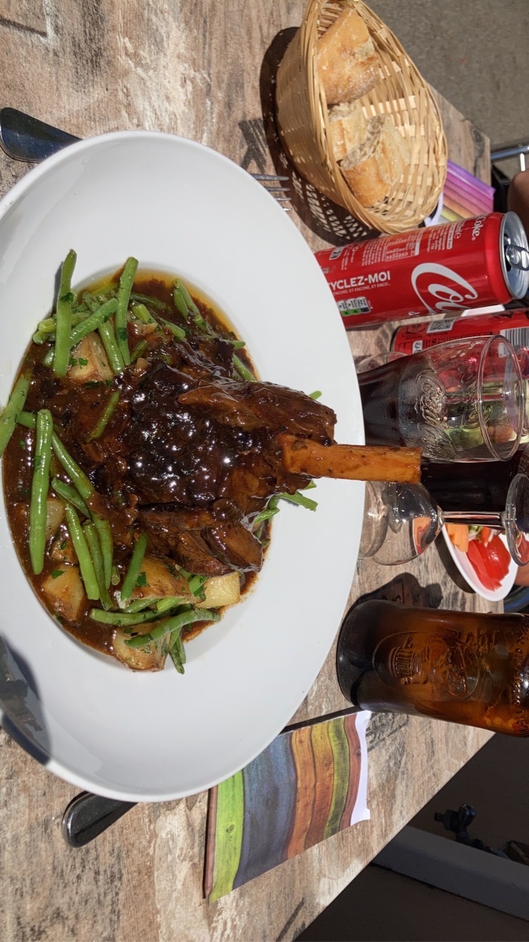 Très agréable de déjeuner à l'ombre des arbres sur la place du village loin de l'affluence des gorges du Verdon . Les pieds et paquets et la souris d'agneau que nous avions choisis étaient bien cuisinés. Le jeune serveur efficace et sympa . Belle halte en moto . Merci