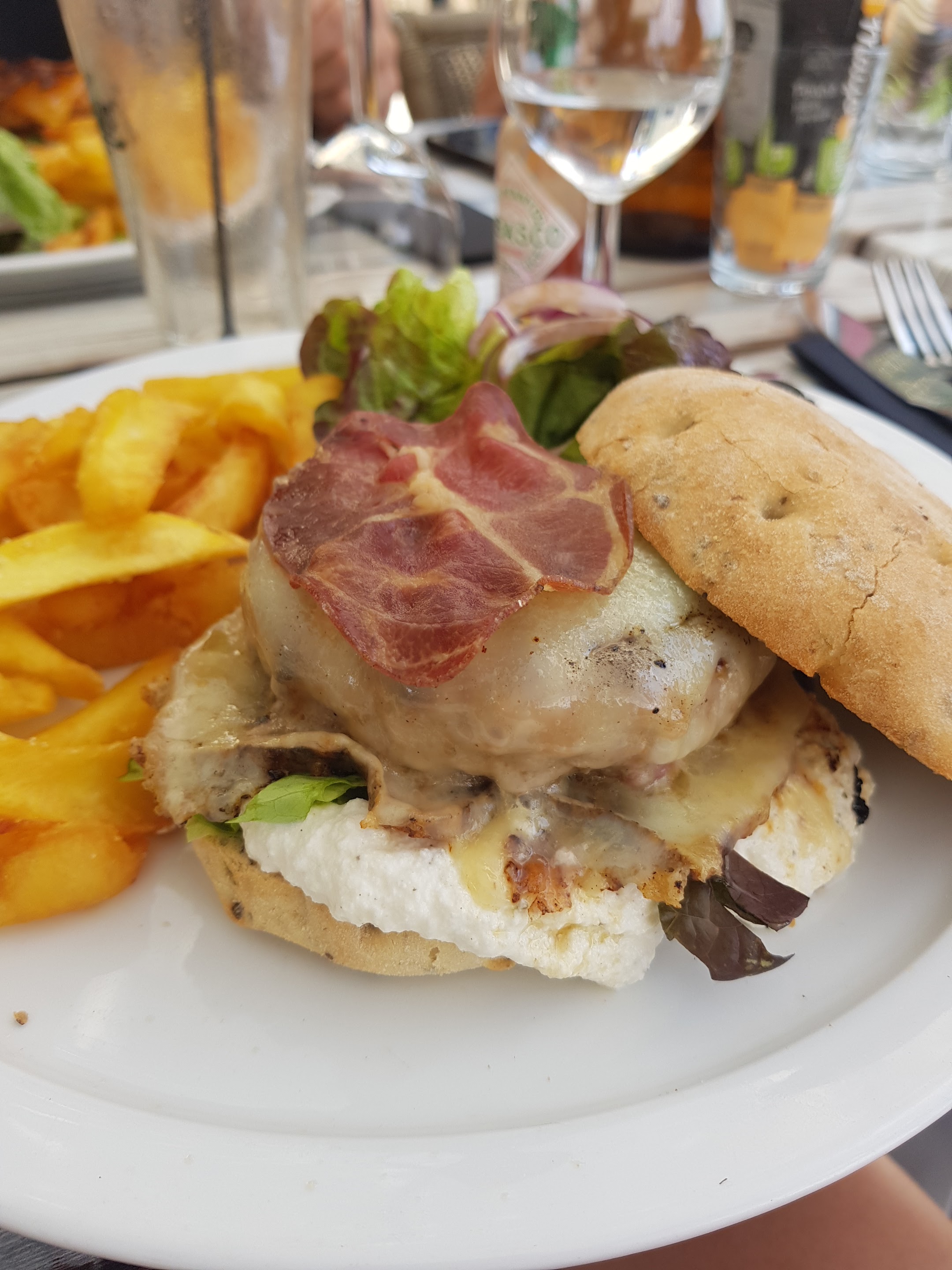 Sommes venus un peu tard et nous avons été servis de suite. Burgers excellents (un gout extra relevé de lard). Frites délicieuses. Une terrasse provençale agréable. Copieux et plein de charme. Je recommande +++