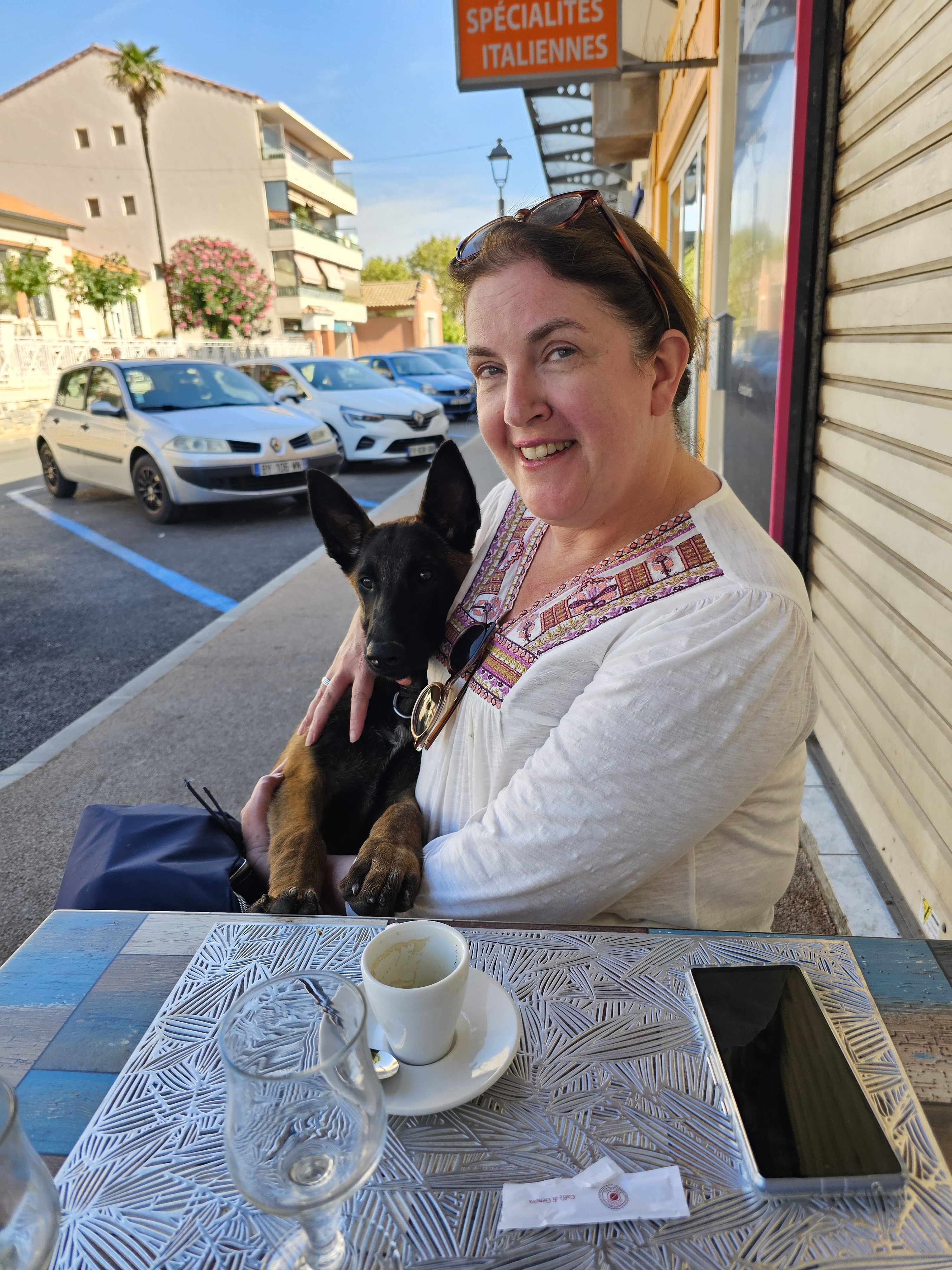 Terrasse à l'ombre. pas facile pour le serveur car il doit traverser la rue même les jours de marché