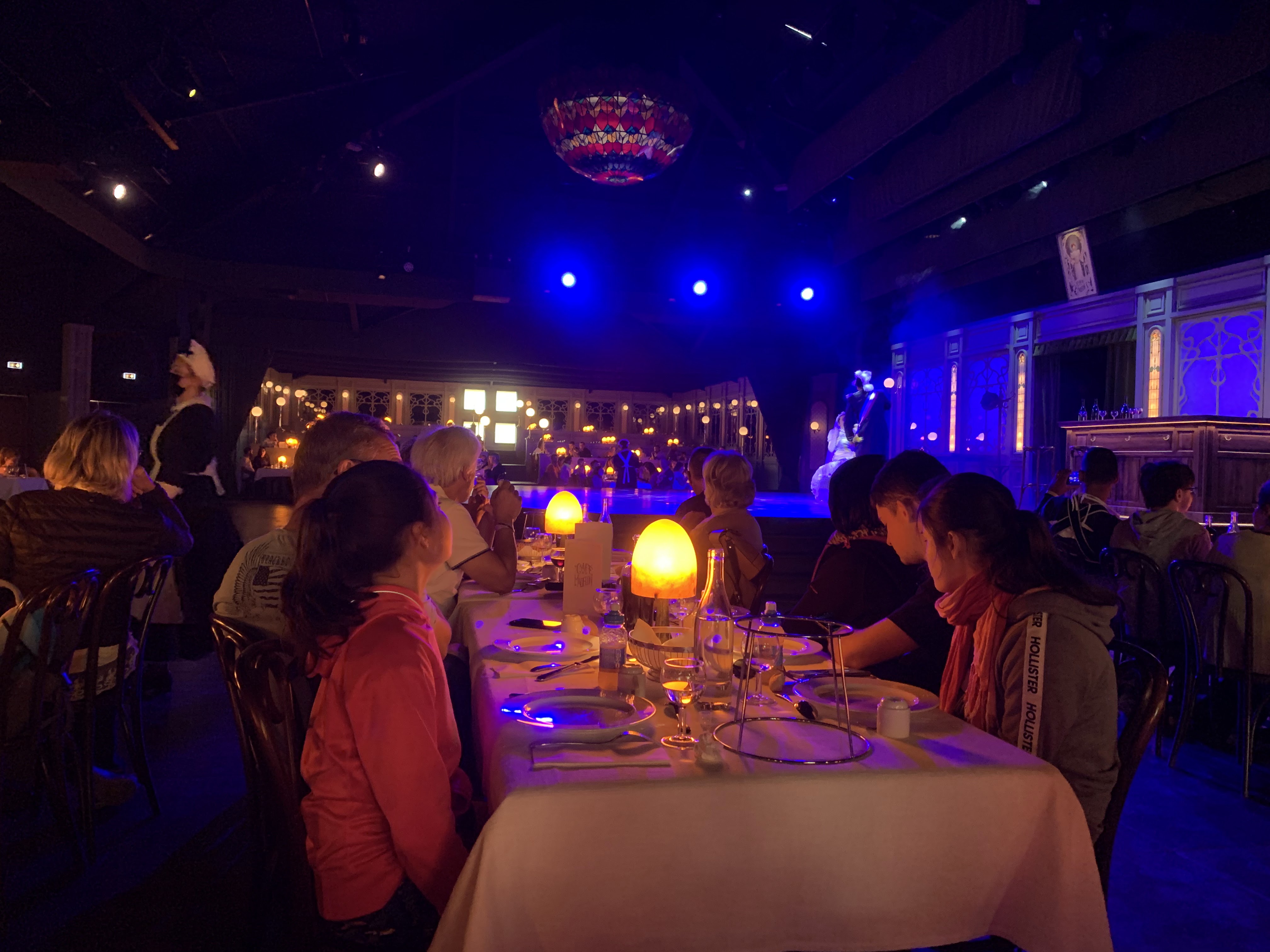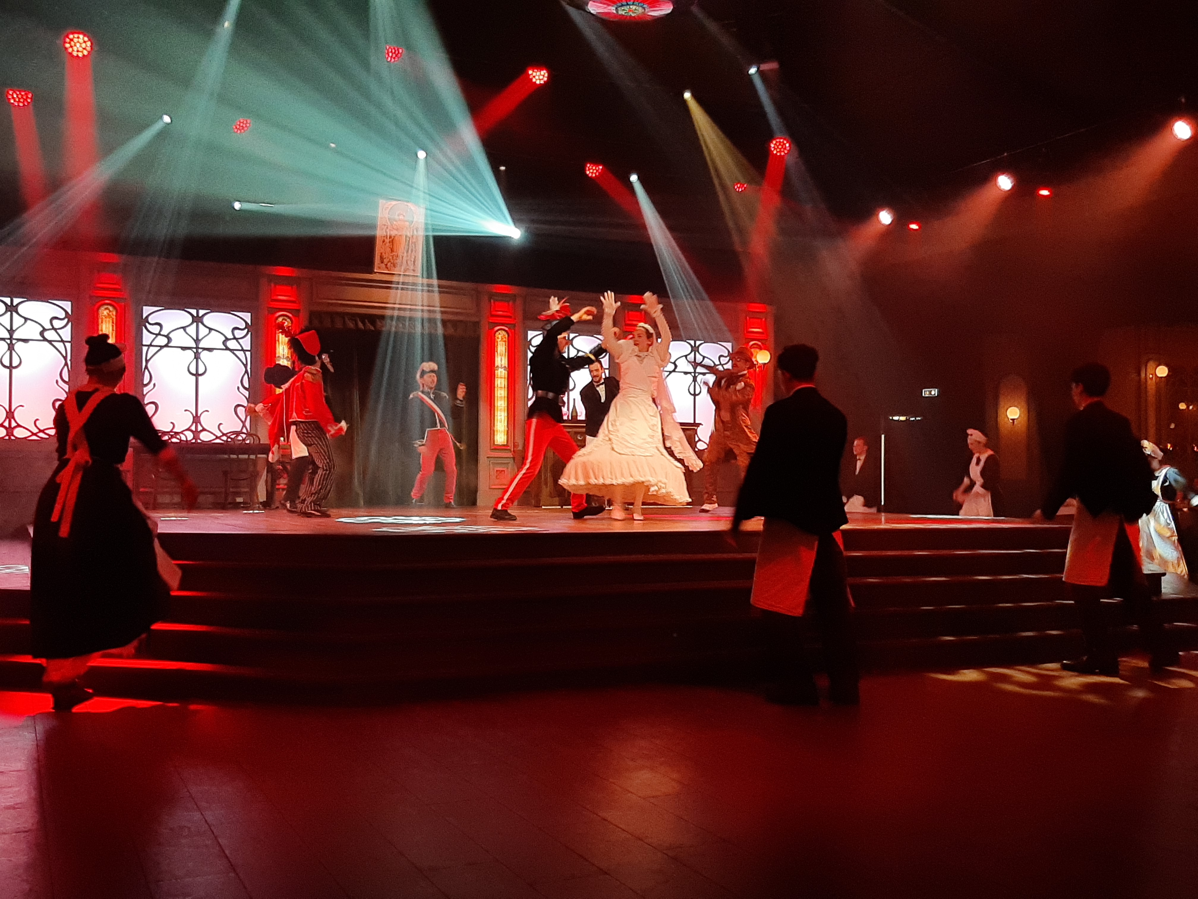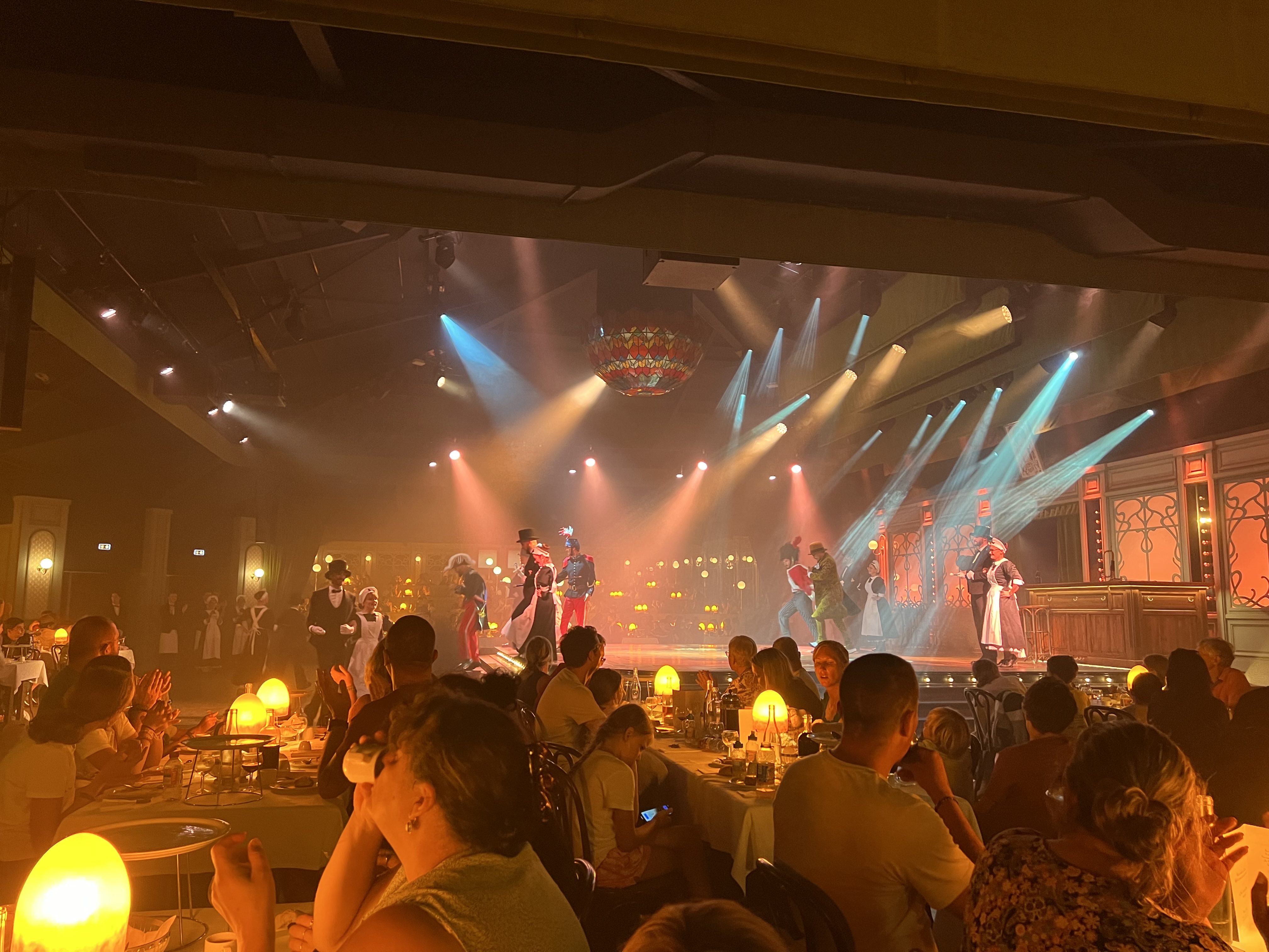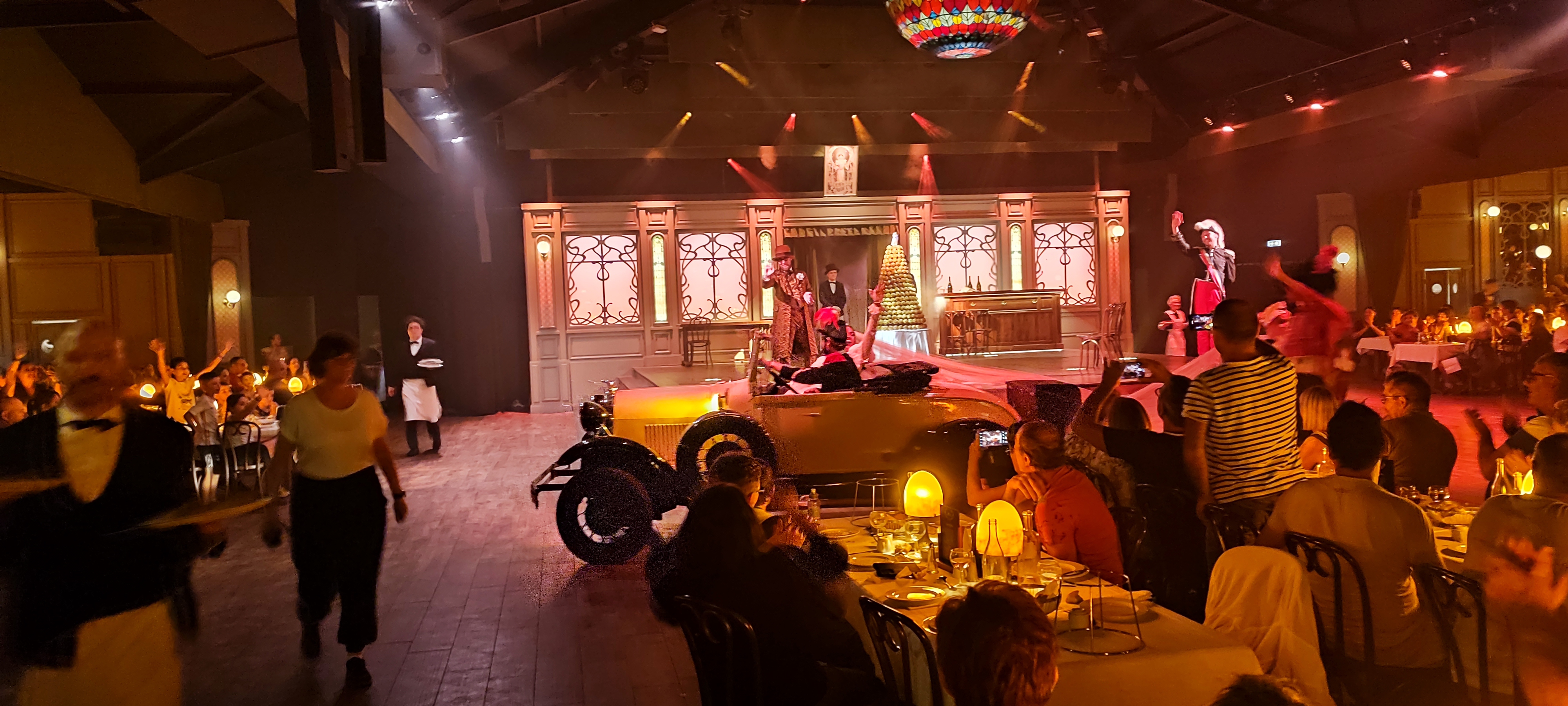 Restaurant animé, dans une grande salle de spectacle décorée et bien réfléchir au décor feutré et tamisé pour 500 personnes et plus. Durant tout le repas, 4 personnages féminins déambule sur la scène et nous font remonter le temps. Incroyable immersion dans les années 1900, avec chants et danses, style cabaret. Voix, costumes, danseuse et costumes exceptionnels!! Le repas est également à la hauteur des attentes, avec des mets tous aussi délicieux et colorés les uns que les autres : feuilleté pommes boudins blancs / noie de joux de boeuf fondants et ses petits légumes / génoise de pomme garnie de vrai morceaux de pommes. A faire absolument !