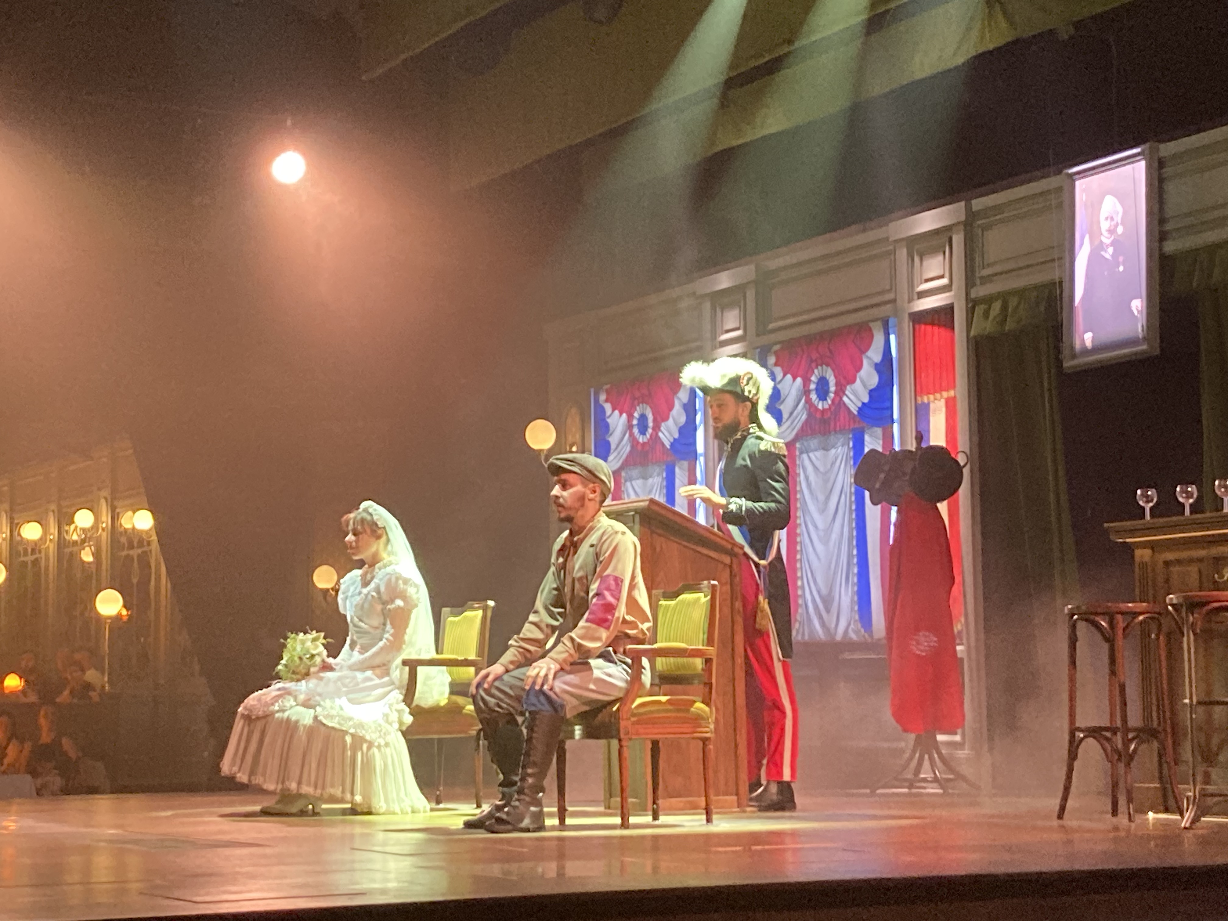 Bonne ambiance au café de la Madelon ou nous sommes conviés au mariage, bon repas bien animé, félicitations aux serveurs,acteurs,cuisiniers pour le bon deroulement de ce banquet