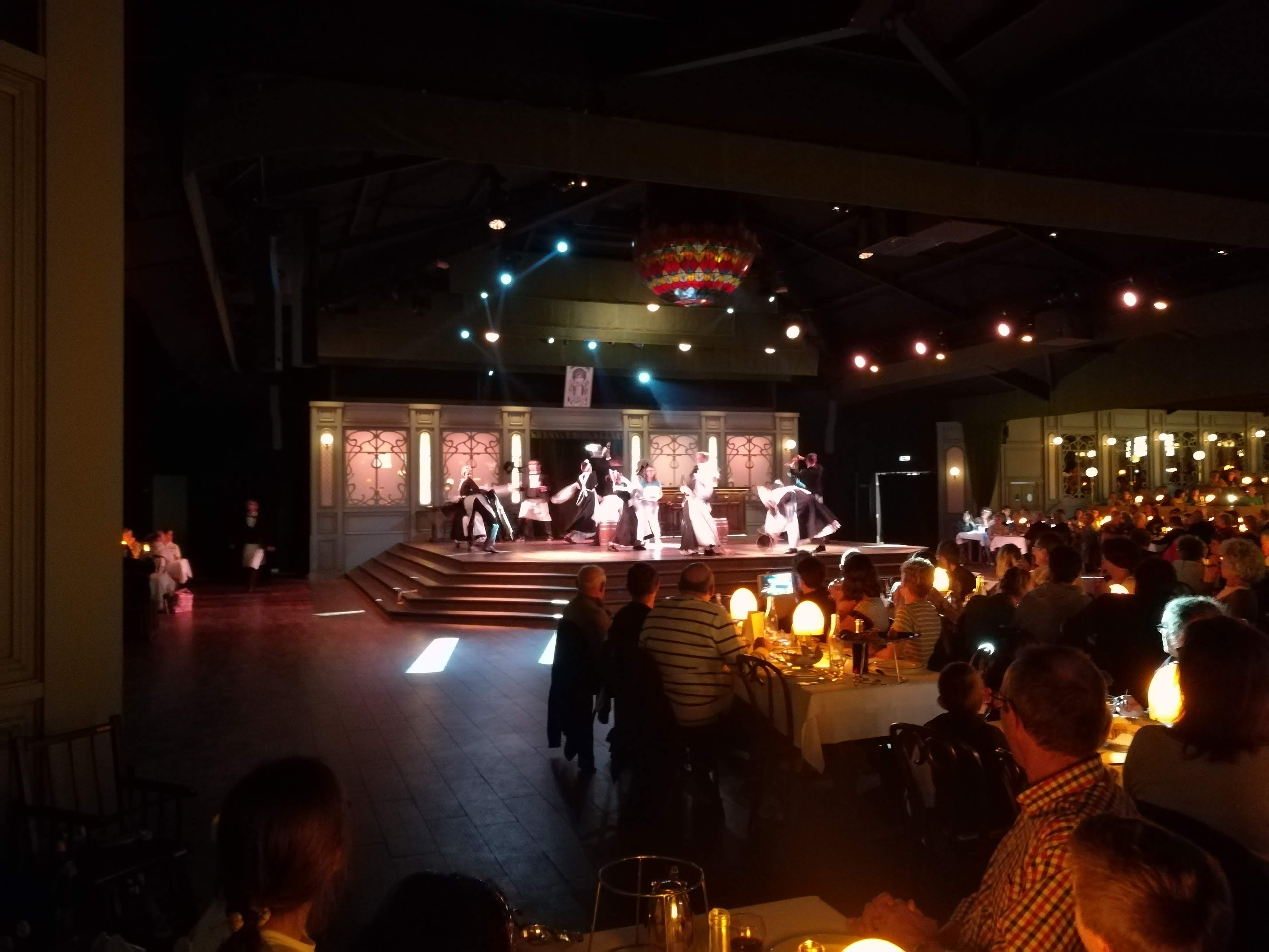 une réservation faite plusieurs semaines à l'avance, nous nous retrouvons places au fin fond de la salle, de surcroît en bout de table. Conclusion : avec nos convives qui se deportent sur le côté, au fil de la soirée, la visibilité du spectacle s'est avérée impossible... Faute de pouvoir assister correctement au spectacle, nous espérons au moins nous consoler avec nos assiettes. Peine perdue ! Une entrée totalement insipide (une sorte de crabe en conserve type restauration industrielle) à peine sauvée par une mayonnaise, une volaille avec de la pomme de terre et une tomate pas cuite et pour finir un chou à la crème tout détrempé... Ne parlons pas du vin qui était vraiment très très vert... Autour de notre table, nous avons pu constater que nombre de plats n'étaient même pas entamés. Les carafes de vin n'était pas finies. Le seul point positif était notre charmante serveuse, une certaine Louisette, jeune fille de tout juste 18 ans, joviale efficace et rapide. J'ai évoqué ces désagréments à la direction de notre hôtel qui nous a assuré prendre en compte nos remarques... Mais bien entendu aucune compensation commerciale n'a été évoquée... Comme les placements sont faits de manière totalement aléatoire, il ne vous reste qu'à espérer être bien placé pour jouir du spectacle et ne pas être trop exigeant sur la qualité de la nourriture dont le niveau est sérieusement en dessous des autres restaurants du parc.