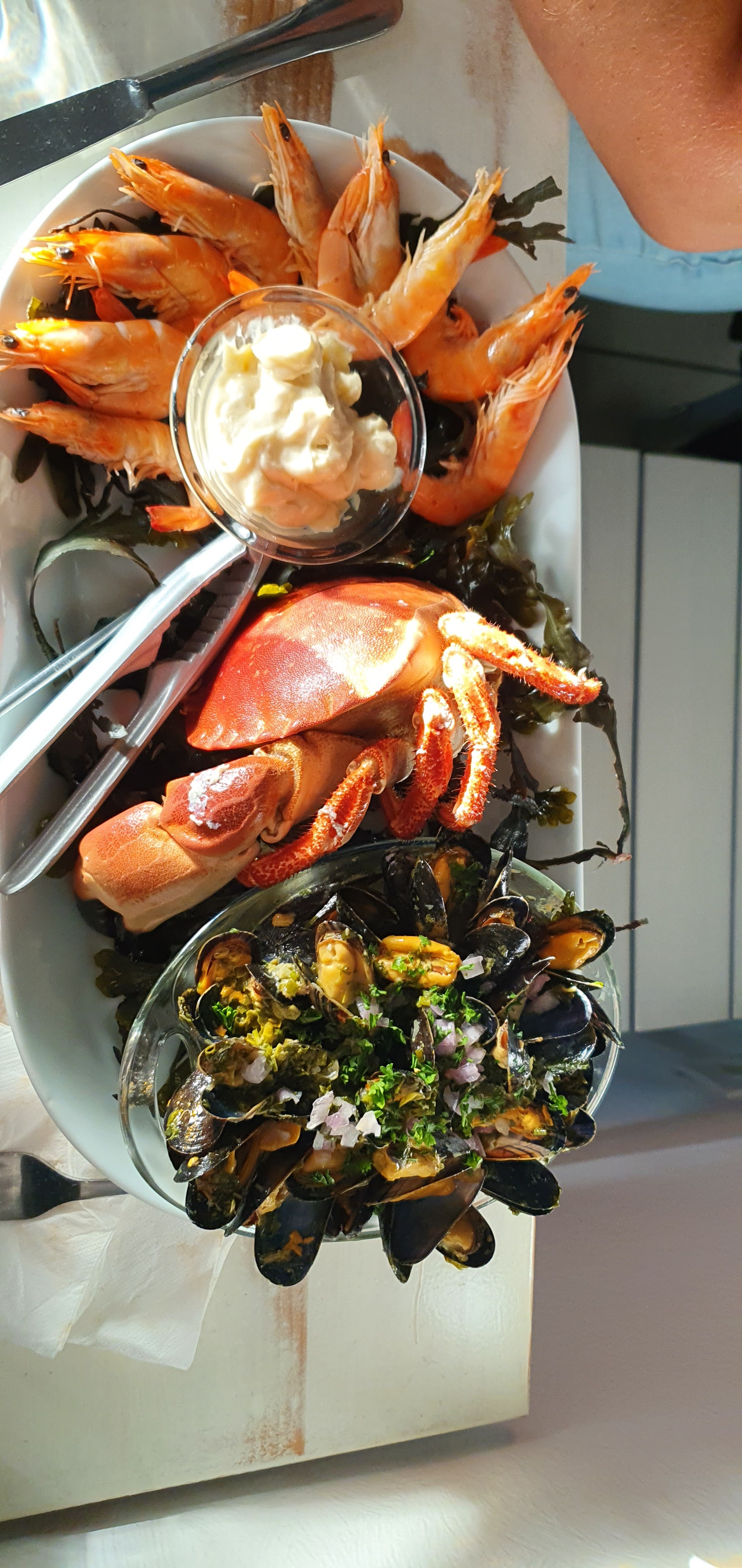 Un restaurant vraiment bien placé, parking juste a côté Un choix de fruit de mer sympa et de qualité. Perso je suis parti sur les moules du jour a la moutarde et jambon de Bayonne, juste excellent ! La camarade a pris un plateau de 1 personne. Excellent aussi! Une adresse a retenir a un prix correct