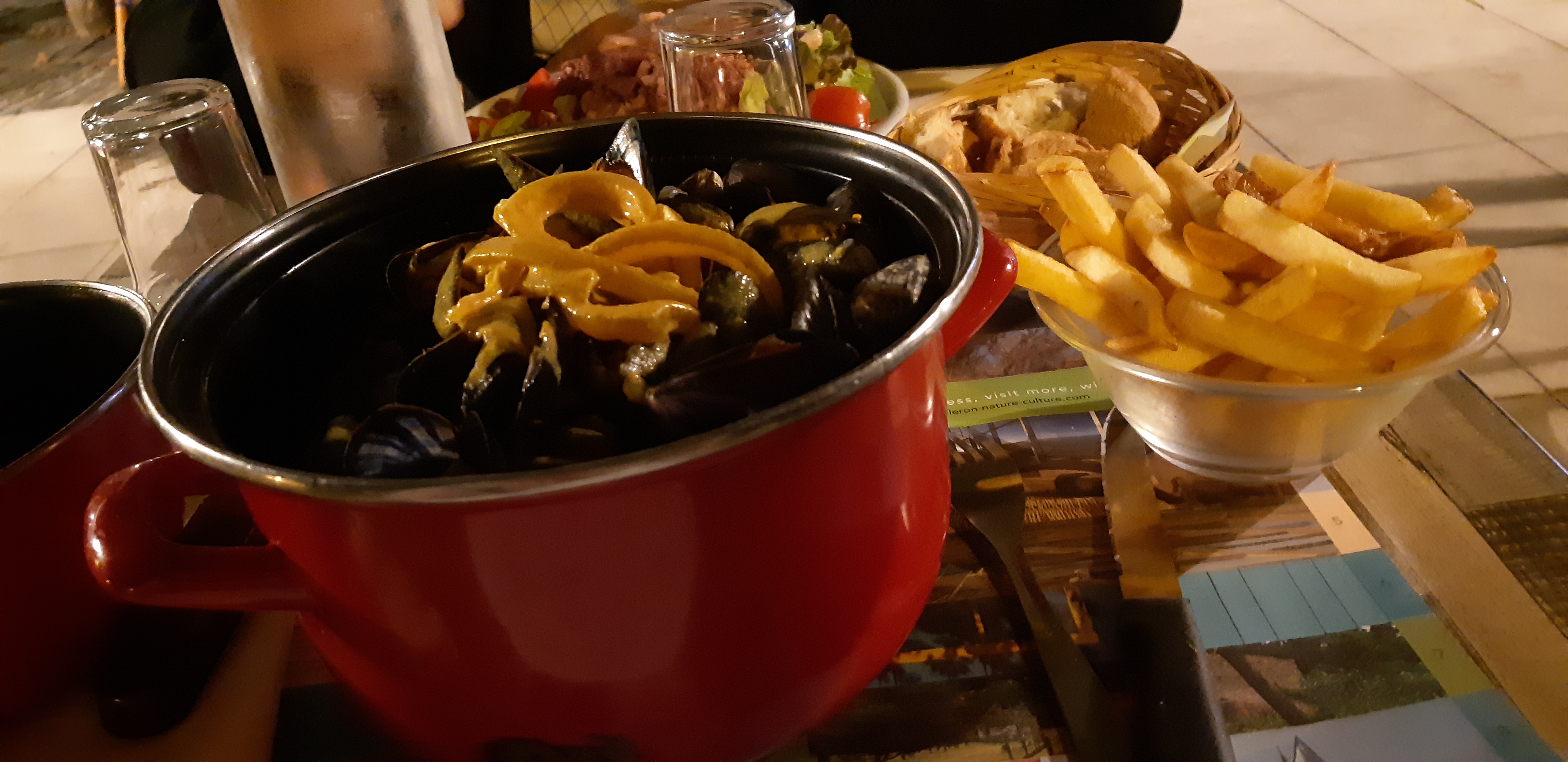 Moules frites (1 à la crème et 1 marinière) : nous avons bien aimé service : bof, un peut long, 2 serveurs différents amènent chacun les verres : donc 4 verres à eau pour 2 sur une petite table avec les moules frites ... faut s'organiser pour que tout rentre ! le 2em serveur aurait du remporter ses verres et non pas dire : tant pis Ambiance : rien de special