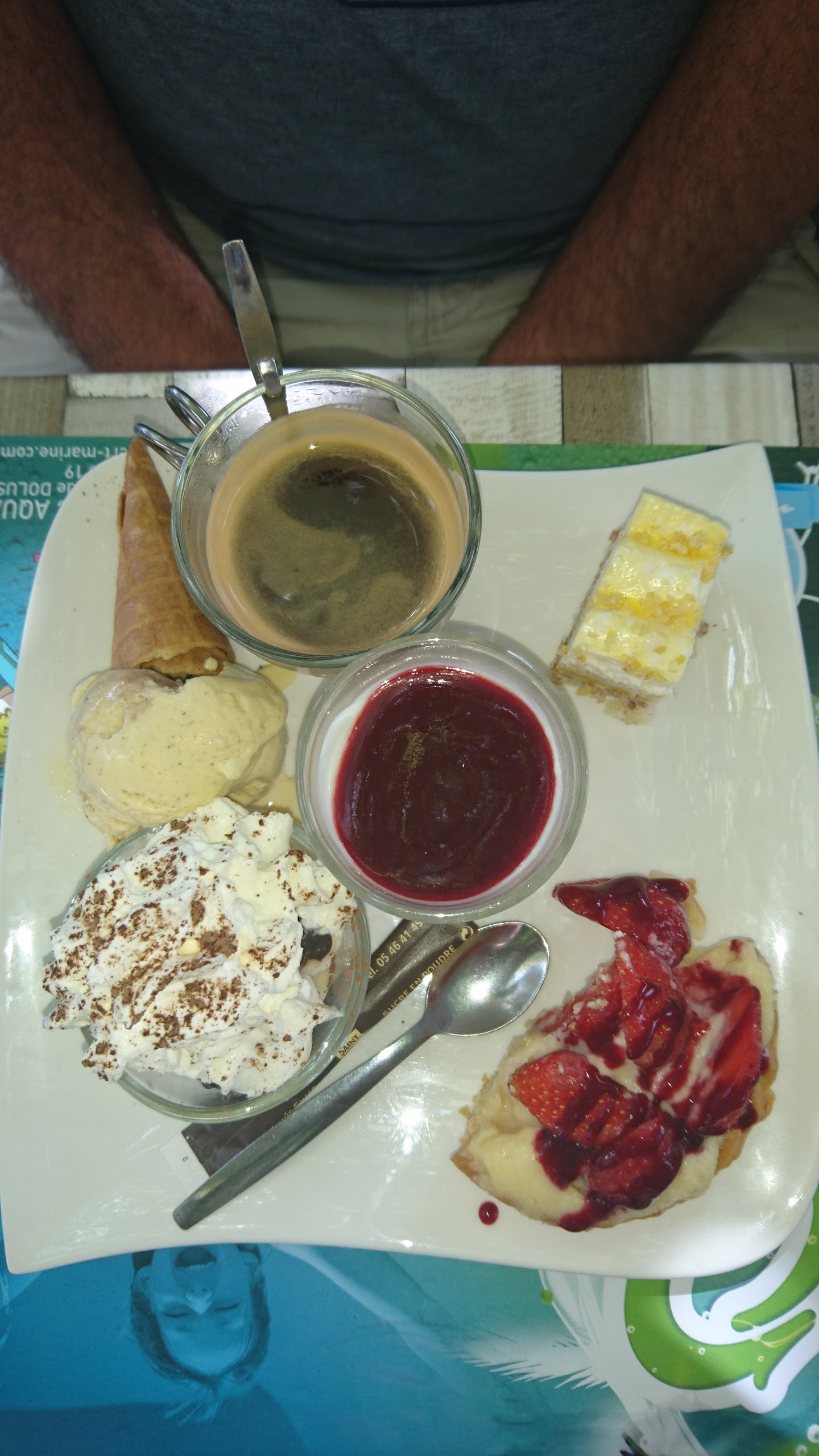Petite pause pour boire un verre et manger une glace. Serveur peu agréable à la limite de l’antipathie. Deux shakes commandés, deux boissons tièdes et coupées à l’eau sont arrivées. Un diabolo pêche commandé, une grenadine arrivée… Et enfin une coupe de glace immangeable, la glace était cristallisées, elle a sûrement du fondre puis recongeler 2-3 fois avant de m’être servie. Vous aurez des nouvelles de ma part si quelqu’un tombe malade. Revenez vite à la raison !!