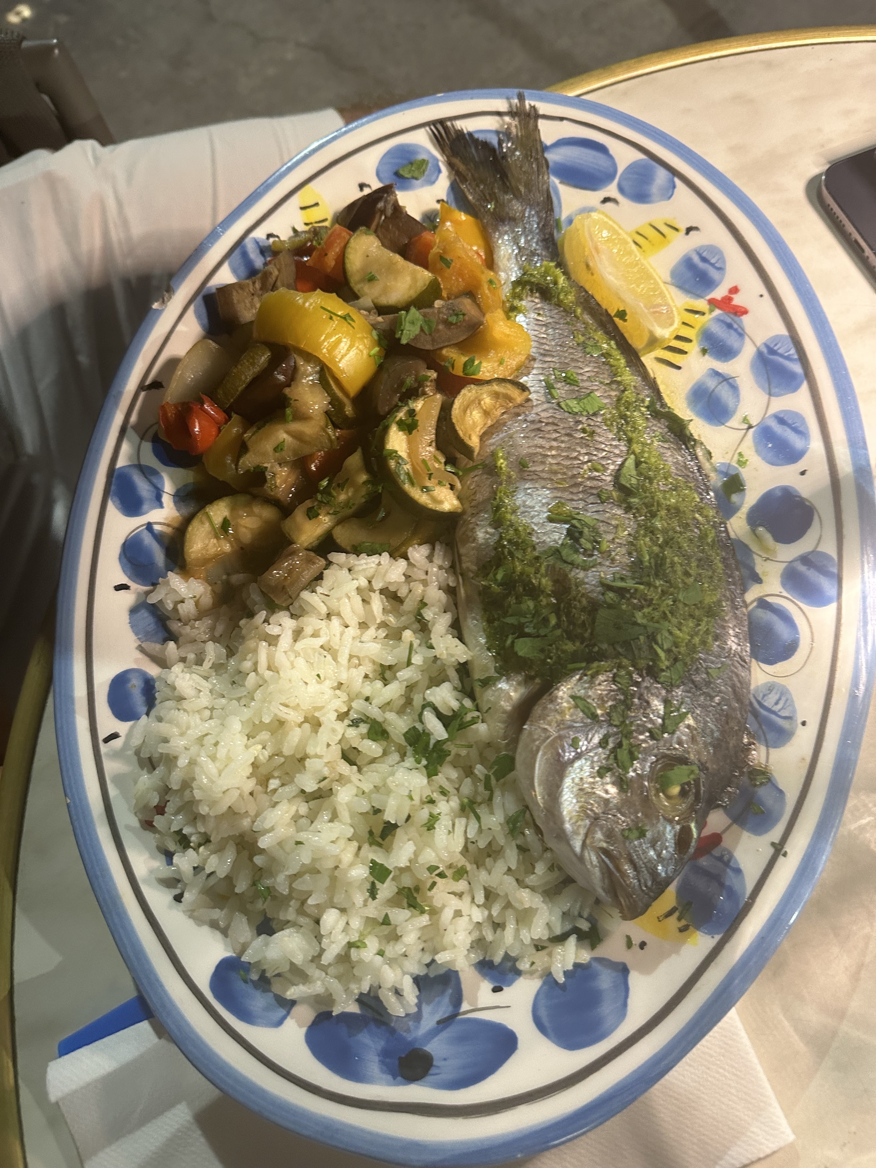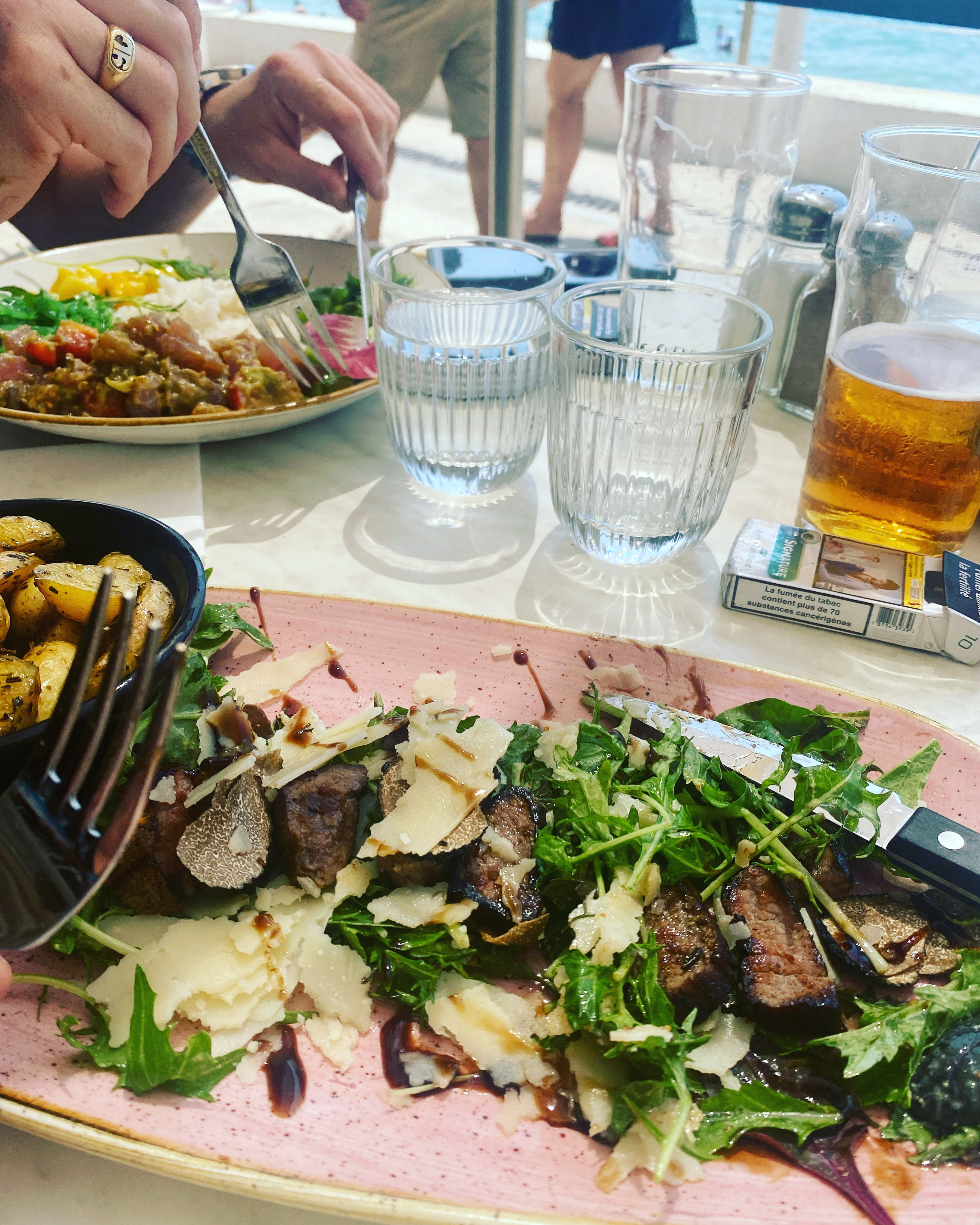 Nous avons commandé une cote de boeuf avec purée truffée et un superbe ail-au-lit. Le tout sur une belle terrasse avec vue mer. Notre serveur, Azzedine nous a accueilli avec beaucoup d’amabilité et s’est parfaitement occupé de nous, comme des autres tables. Toujours en empathie avec chaque client. Un service impeccable de pro. C’est rare
