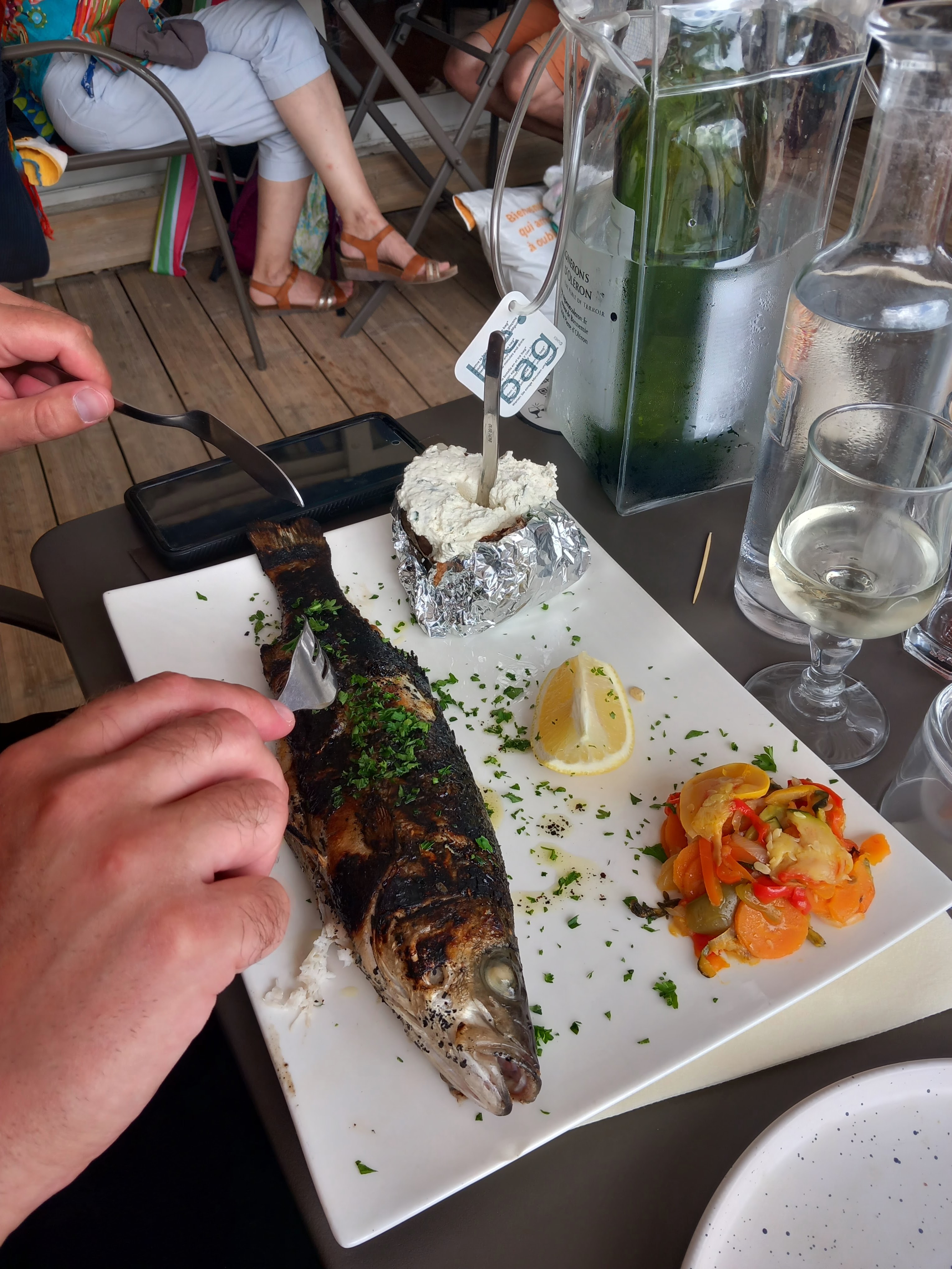 Le cadre, le service, la cuisine, tout est parfait. Emmener 3 enfants en bas-âge au restaurant, c'est possible. Ils se sont amusés tranquillement pendant que nous avons dégusté un magnifique tartare de bonite parfaitement assaisonné, un merlan grillé au feu de bois avec ses tomates juteuses accompagné d'un très bon vin blanc local en pichet . Il y en a pour tous les budgets et tous les palais. Le tout à l'ombre et l'océan en arrière plan Pensez à réserver