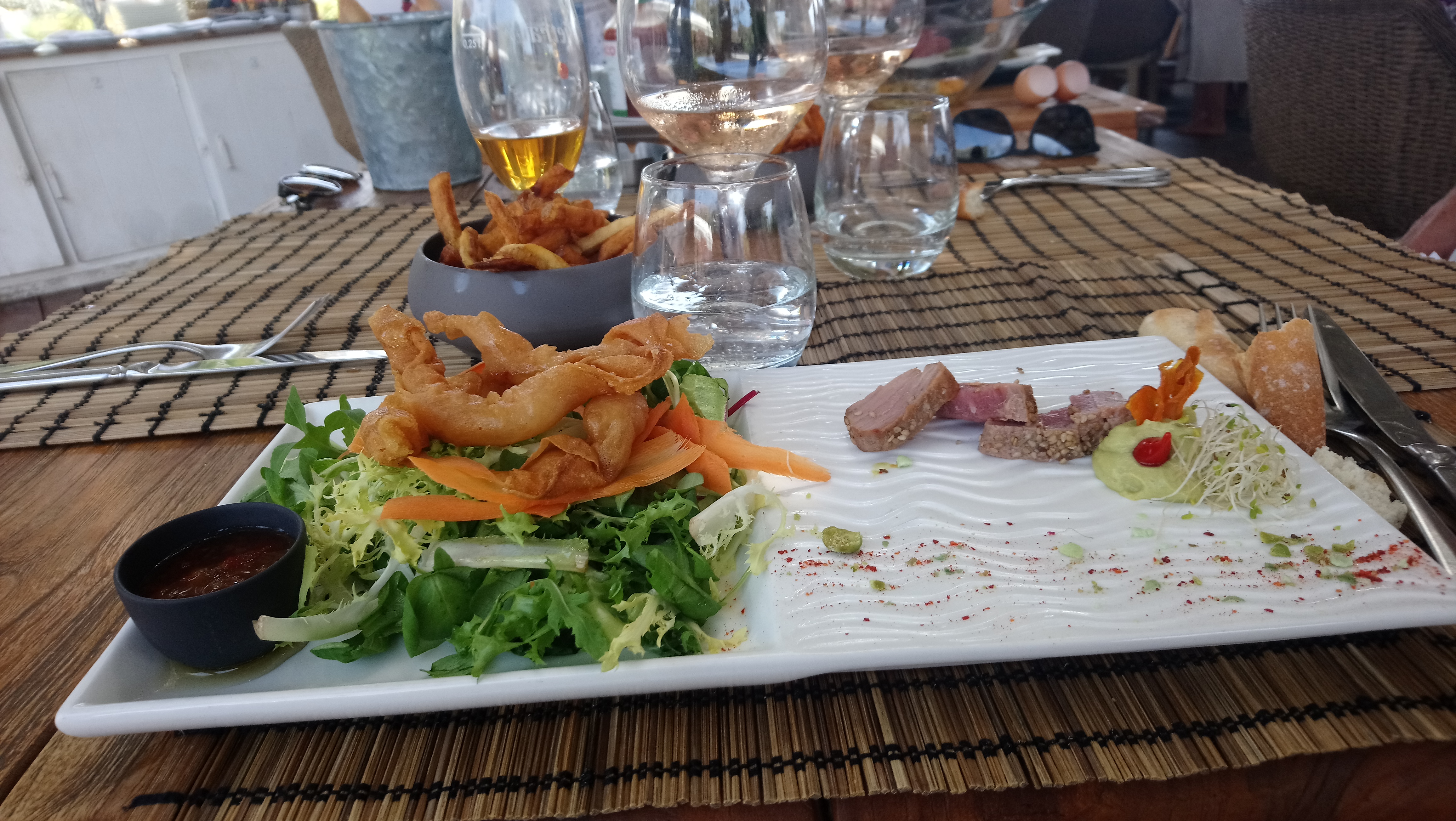Délicieux, j'ai mangé une salade,St Jacques foie gras à tomber. Mon compagnon thon mi-cuit pareil. Côté plage est incontournable. L' accueil est aussi bon que cequ'on dans l'assiette. Y aller absolument.