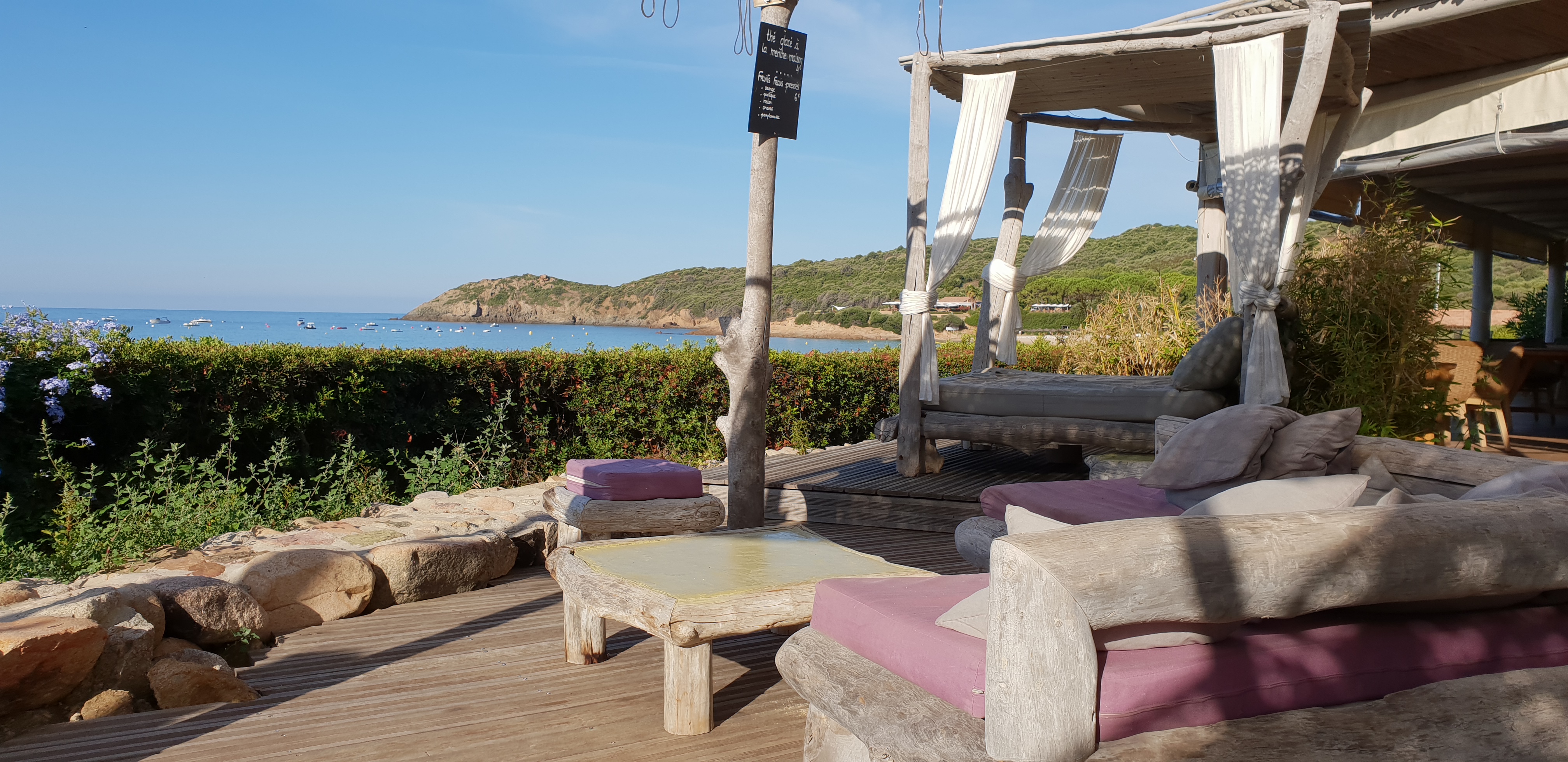 Super cosy pour boire une bière en fin de journée, magnifique vue sur le coucher de soleil et la belle plage d'Arone, Les canapés d'extérieurs sont confortables, et le service rapide et très souriant ! Merci !