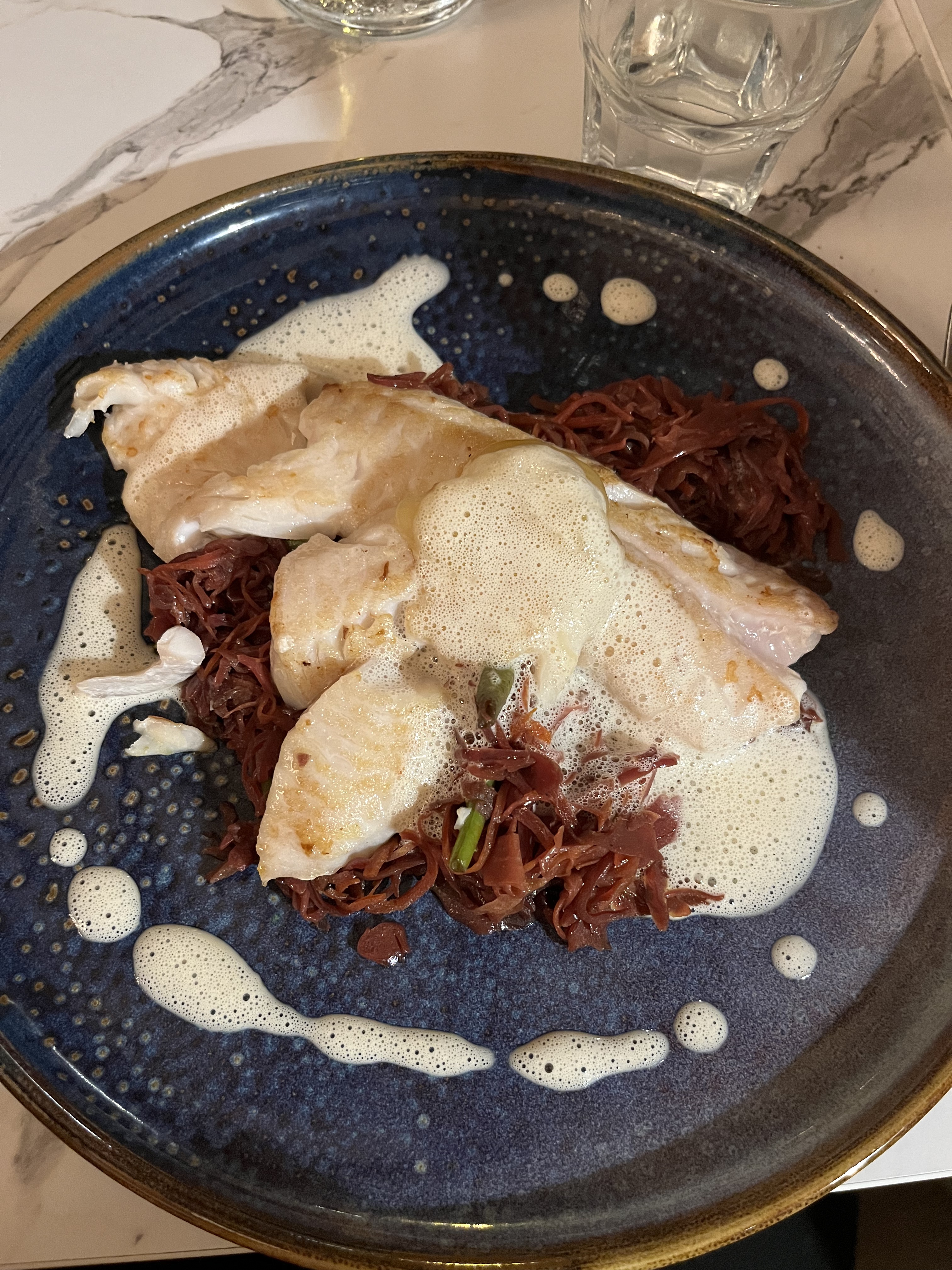 Ce midi j'ai choisi un plat de lieu jaune avec patates douces sauce aïoli et légumes rôtis, sur la carte. Dans mon assiette à 22 euros il y avait le poisson, pas de patates douces ,sur sauce Aurore , et en accompagnement un demi oeuf dur deux mini fleurettes de choux fleur, un centimètre de carotte et une demi rondelle de betterave. Cet accompagnement digne d'une assiette d'enfant de trois ans m'a laissé sur ma faim.