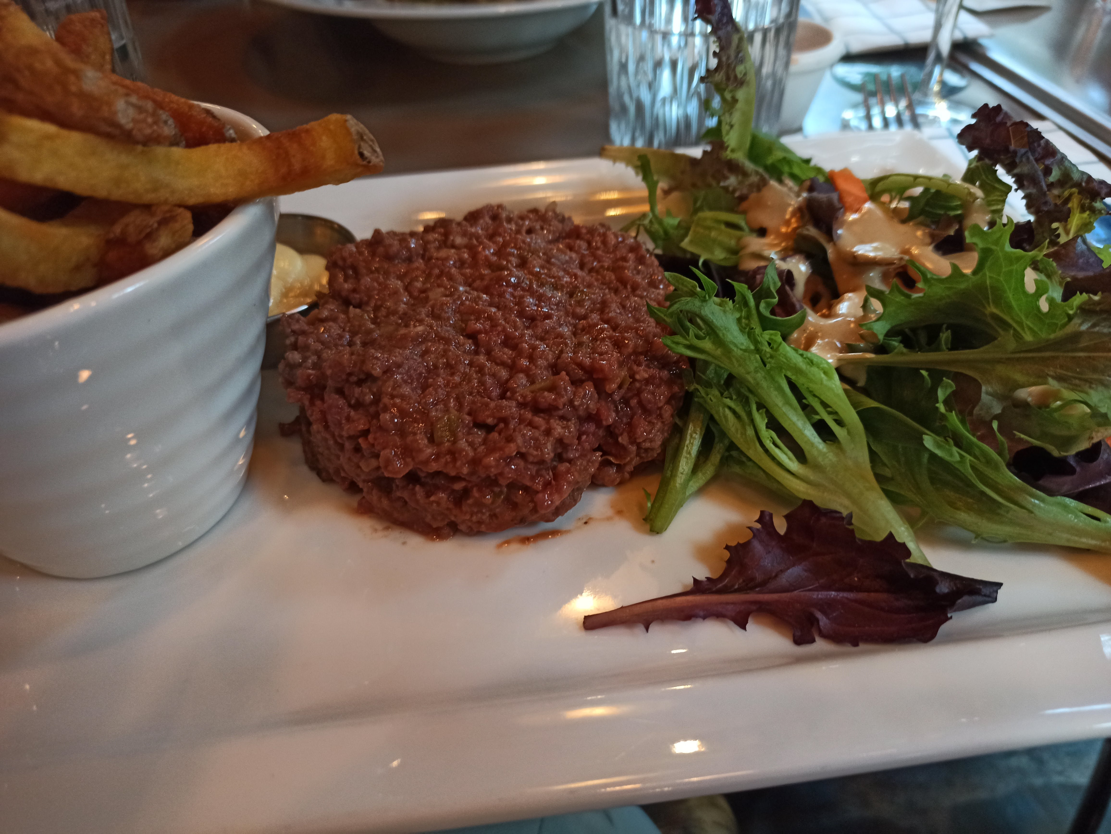 Le plus mauvais steak tartare qu'il m'ait été donné de manger, bouillie dont le goût prééminent était celui du vinaigre, frites molles et grasses. Quant au dessert, une boule de glace au caramel assortie de crème fouettée et de 2 tuiles, c'était tout juste correct. Bref la seule valeur sûre de ce repas aura été le Coca-Cola ! Tout ceci pour 32€: à fuir !!!