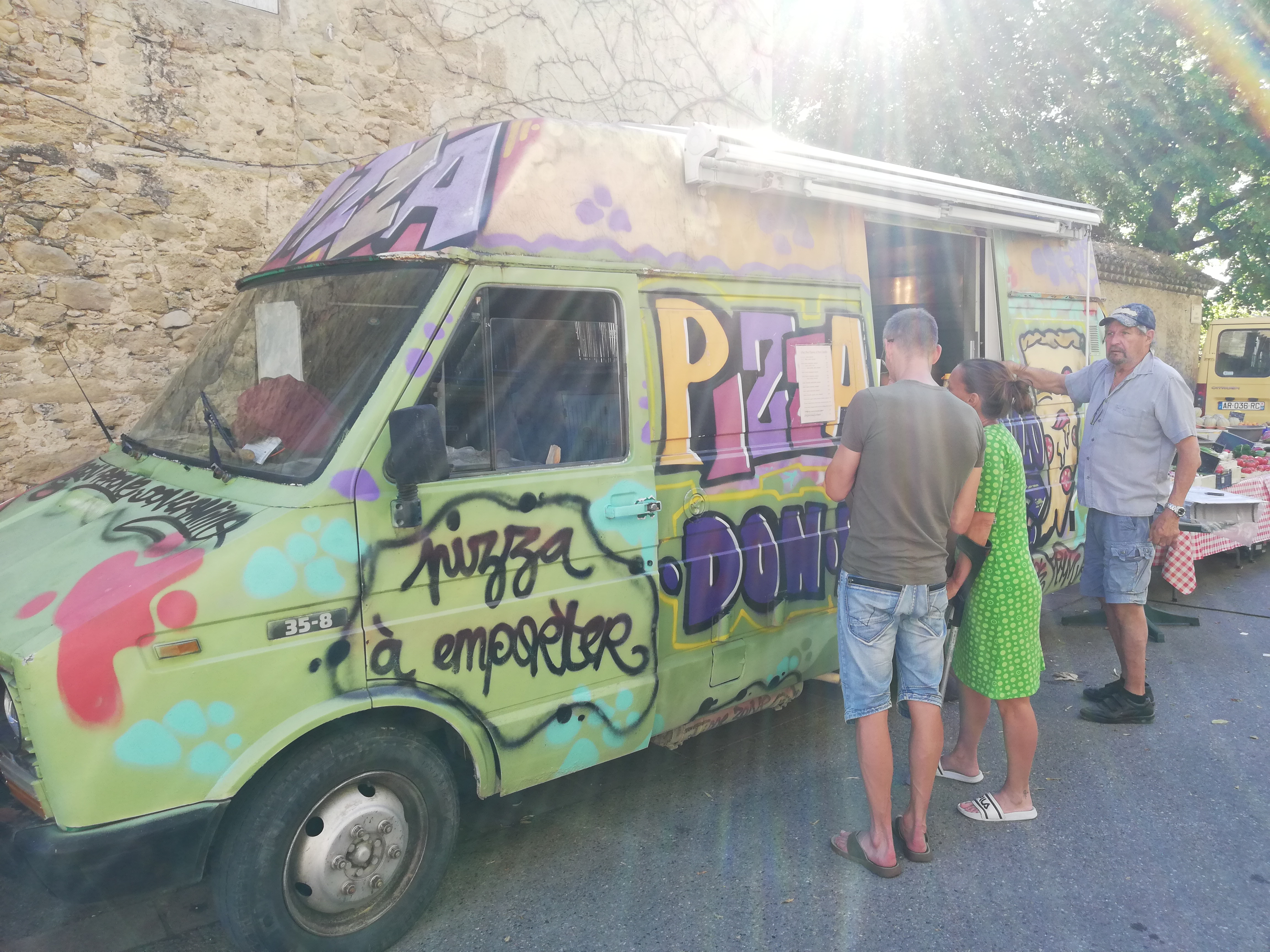 Parfait pour boire un verre, et le mercredi et samedi : des pizzas fantastiques du chariot à pizza du village de Puymeras ! L'ambiance est douce, conviviale, et le maire lui-même participe aux services. Vive la France!