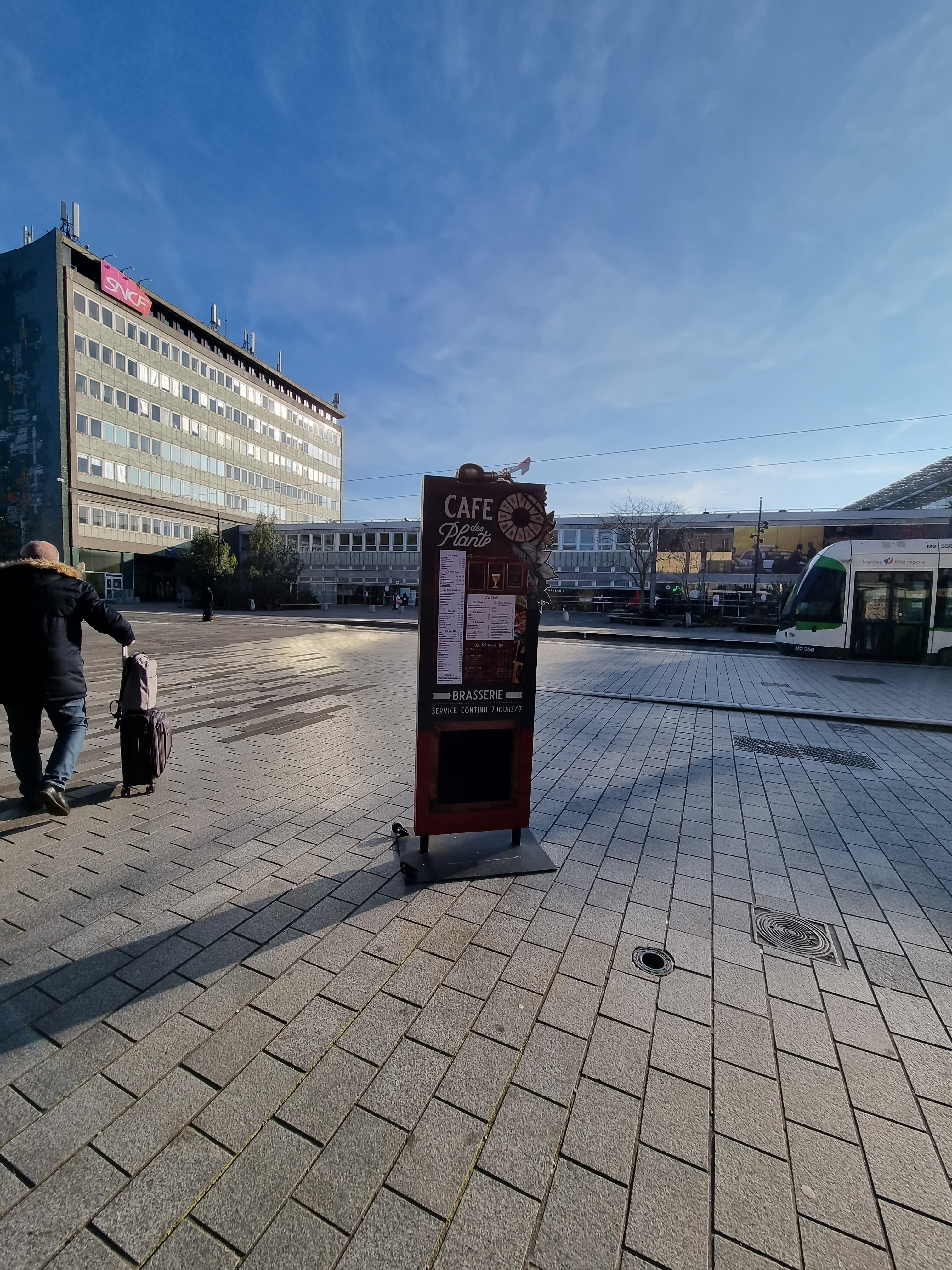 Le nouveau parvi entre la gare et le jardin des plantes à permis en outre de supprimer la circulation et d'ouvrir les terrasses de café sur un espace et vue agréables. C'est le cas du café des plantes qui porte bien son nom , ou l'on peut flemmarder tranquillement en buvant un café ou déjeuner. Le serveur avec la barbe paraît serieux mais reste très efficace pour ses clients .