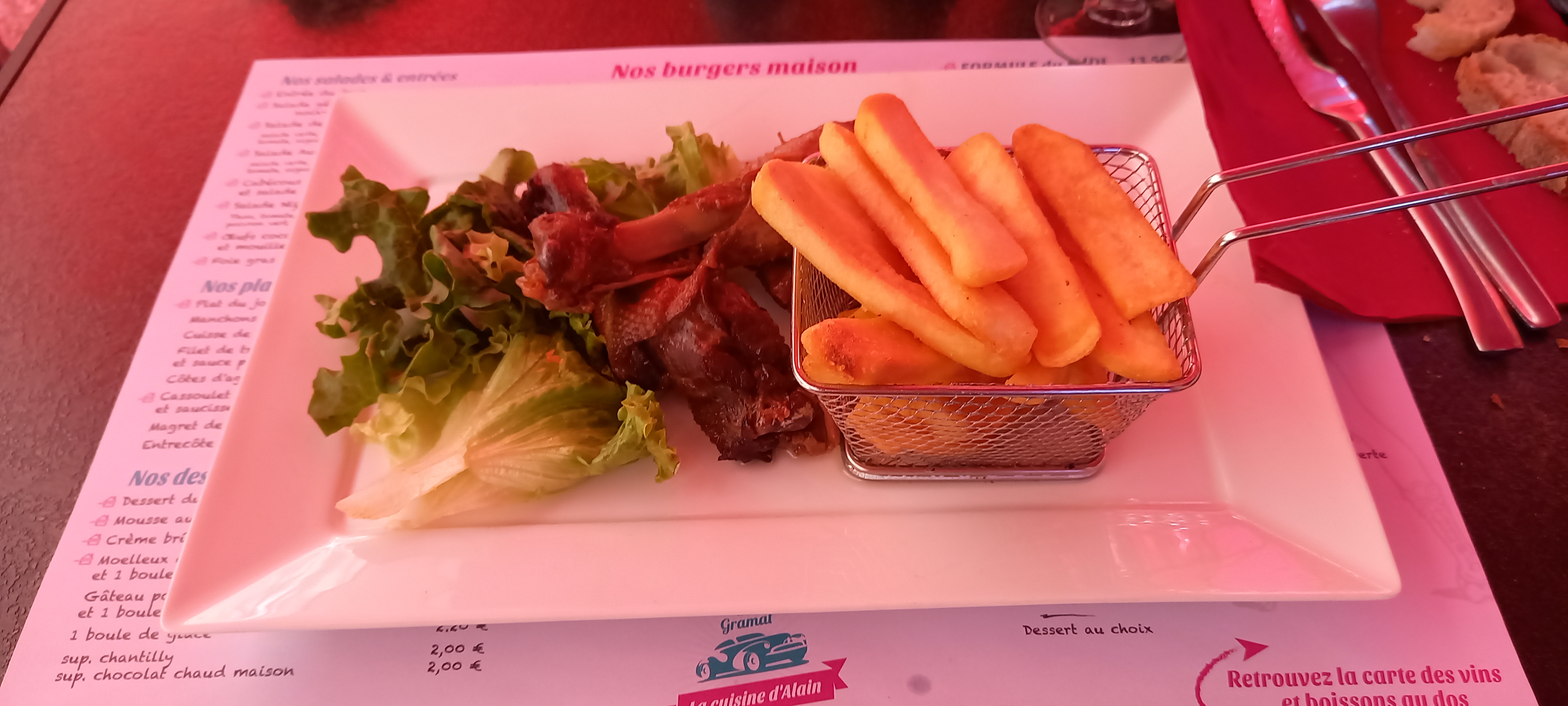 Nous nous sommes arrêtés dans ce restaurant totalement au hasard, vu l’heure tardive nous n’avions pas le choix, et on ne le regrette pas. Hamburgers pour les enfants, cassoulet pour Monsieur et confit de canard pour moi. Nous nous sommes régalé.
