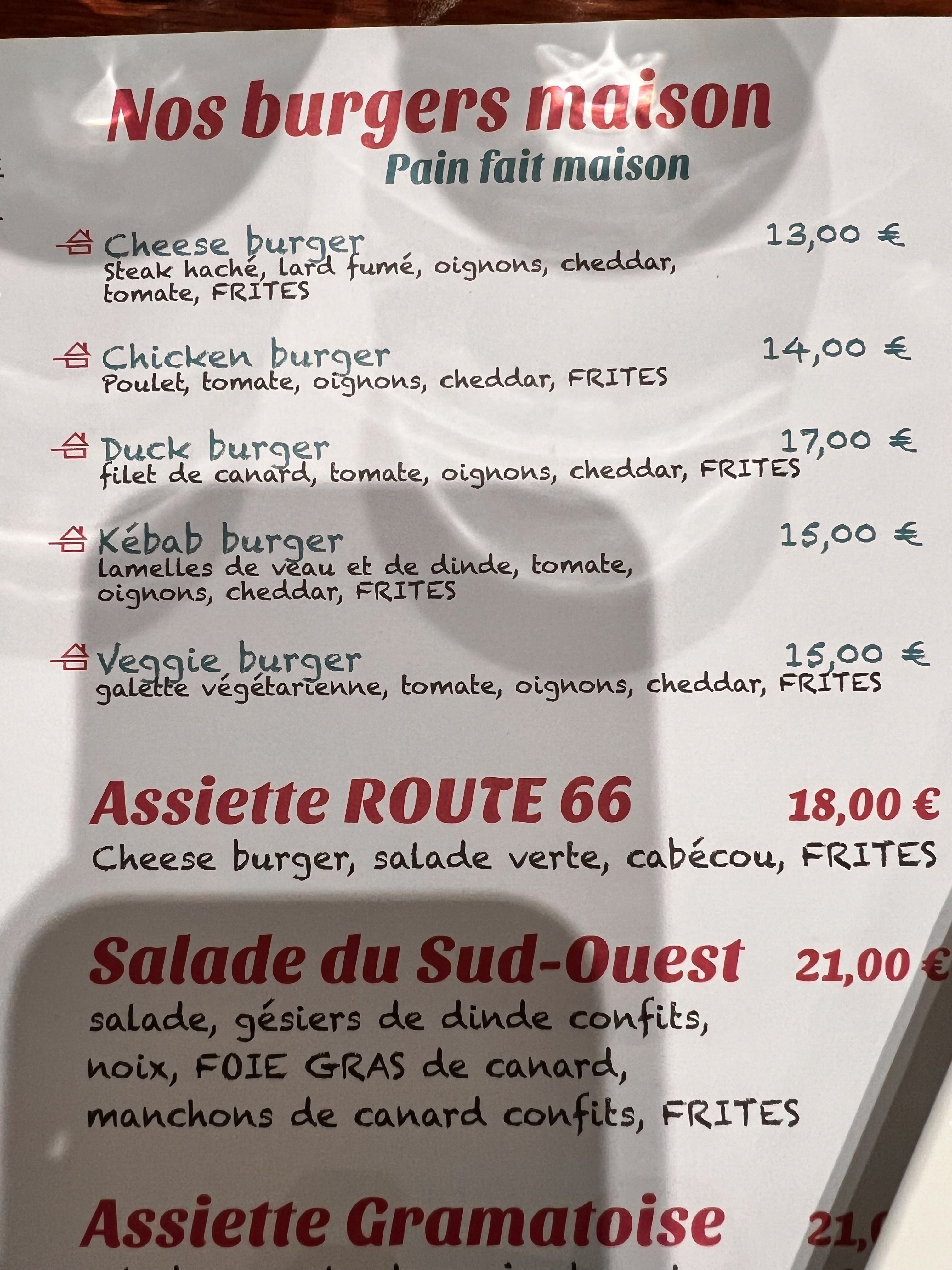 Quand on fait des Burgers en se référant à la route 66, on se doit d’y mettre de la viande mangeable... surtout dans une région comme le lot! Région de terroir et de produit de qualité... Une catastrophe... pour 11euros, je comprends qu’il soit difficile de mettre de la bonne viande mais mieux vaut proposer 12 ou 13euros et un produit de qualité, surtout lorsque l’on se targue d’avoir du pain fait maison... bref, dommage. Je ne suis pas prêt d’y revenir... Par ailleurs, le restaurant à moitié vide, les serveurs demandent aux clients qui s’assoient d’aller plutôt à une autre table!!! Témoin de la scène avec un bon résultat : 2 tables perdues... pas étonnant. Vous avez perdus 4 clients à 14h15!! A la limite, tant mieux pour eux!