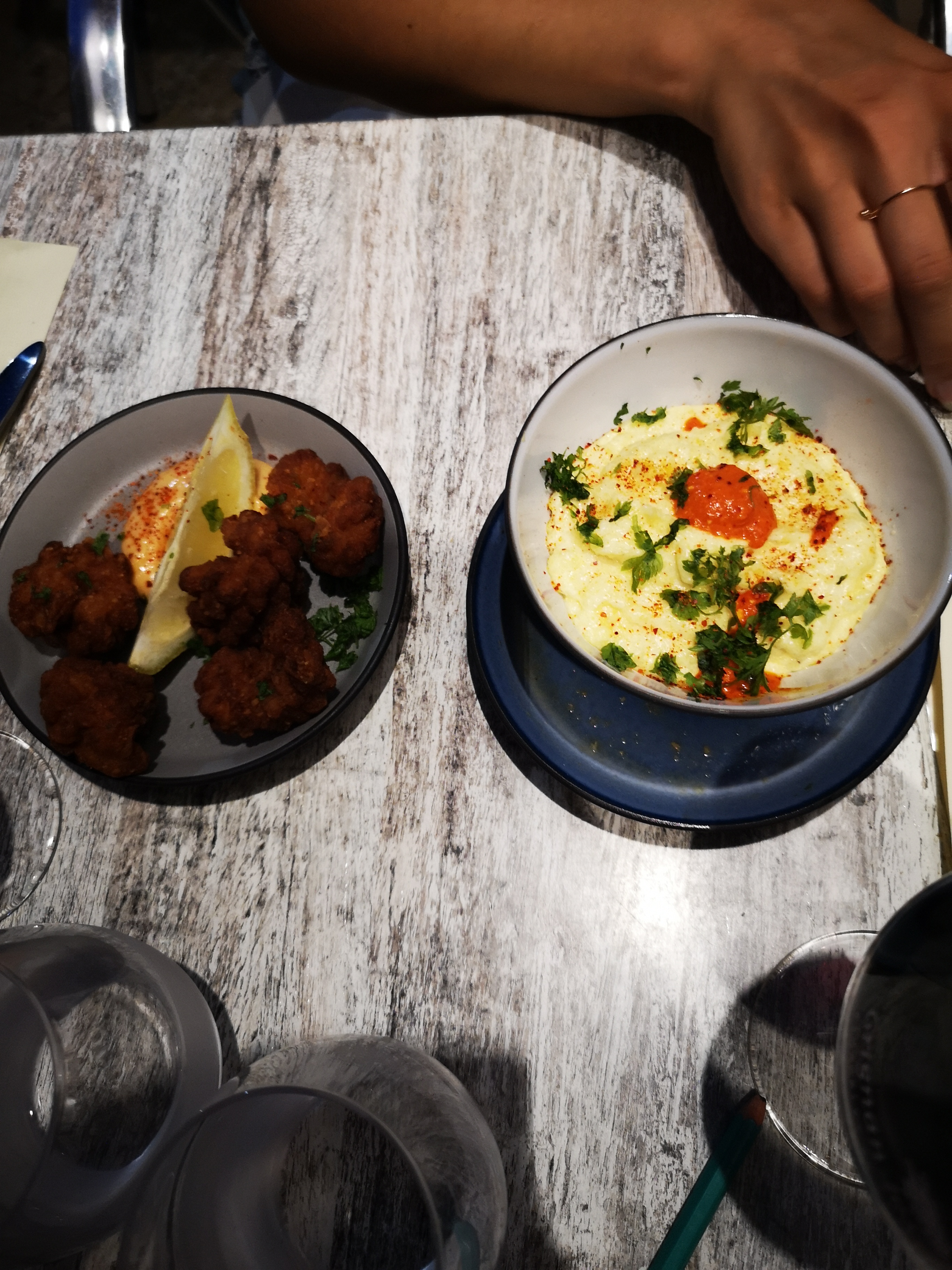 Le service était sympathique mais la nourriture n'était pas bonne. Nous avons pris des tapas (humus, tomate-mozzarella et croquettes de poulet) et nous avons rendu nos assiettes presque intactes. Le poulet était juste en purée, les tomates n'étaient pas fraîches et la sauce avait un goût étrange. Cela faisait longtemps que nous n'avions pas mangé d'aussi mauvaise nourriture