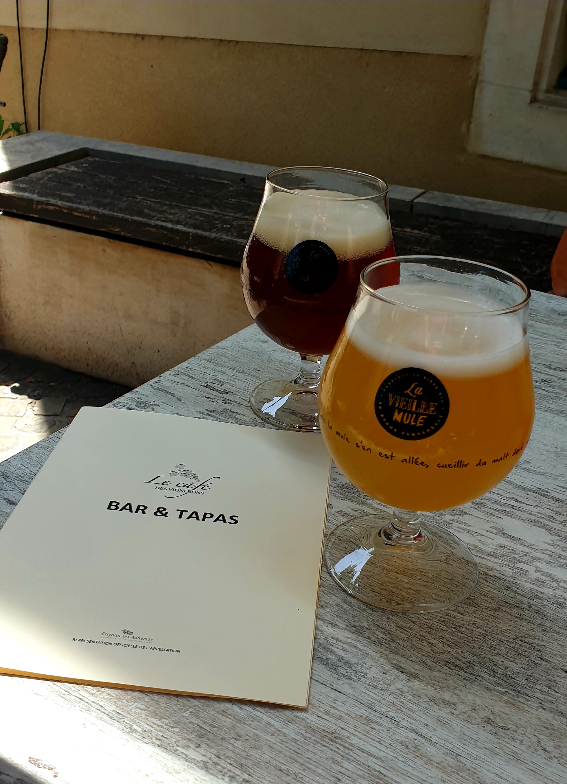 Un lieu sympa dans un joli cadre avec une belle carte des vins et la possibilité des les goûter avec des tapas. Une bonne bière artisanale et le tout servis par une serveuse aimable et efficace. Idéal en after théâtre de Grignan l'été.
