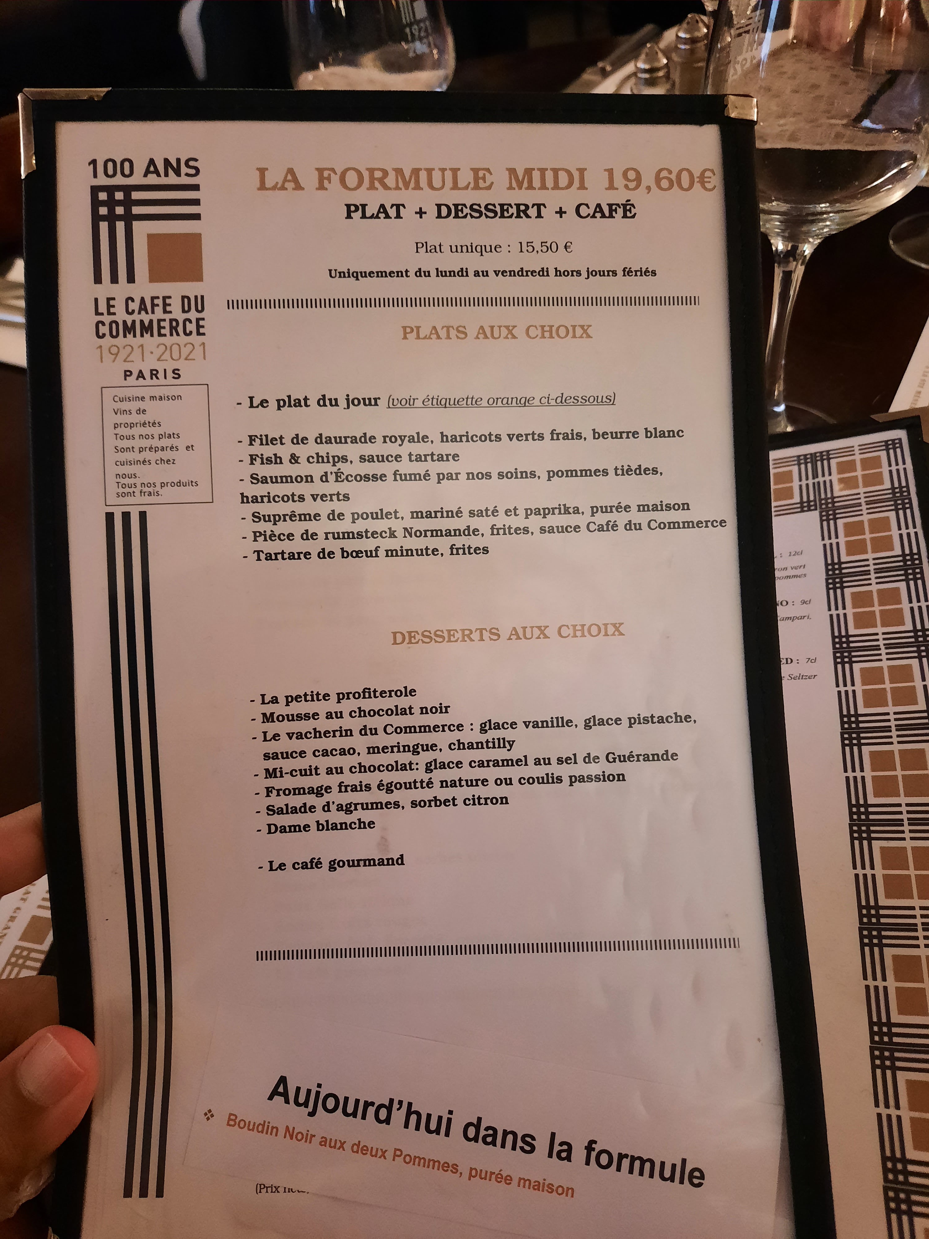 Le Café du Commerce m'a déçu par de petites erreurs de service : j'ai rajouté un enfant à ma réservation (désistement de babysitting) et on m'a fait monter au deuxième étage avec le porte bébé pour me dire que finalement la table était au rez-de-chaussée... Puis le pain du gravelax était dur et mes poireaux vinaigrettes insipides. Par contre, le lieu est exceptionnel par sa décoratif et l'efficacité du serveur. Ma tête de veau (cervelle comprise, ce qui est rare à Paris), délicieuse. Un lieu un peu dépassé par la horde de touristes qui n'y connaît rien et qui par conséquence, perd en qualité.