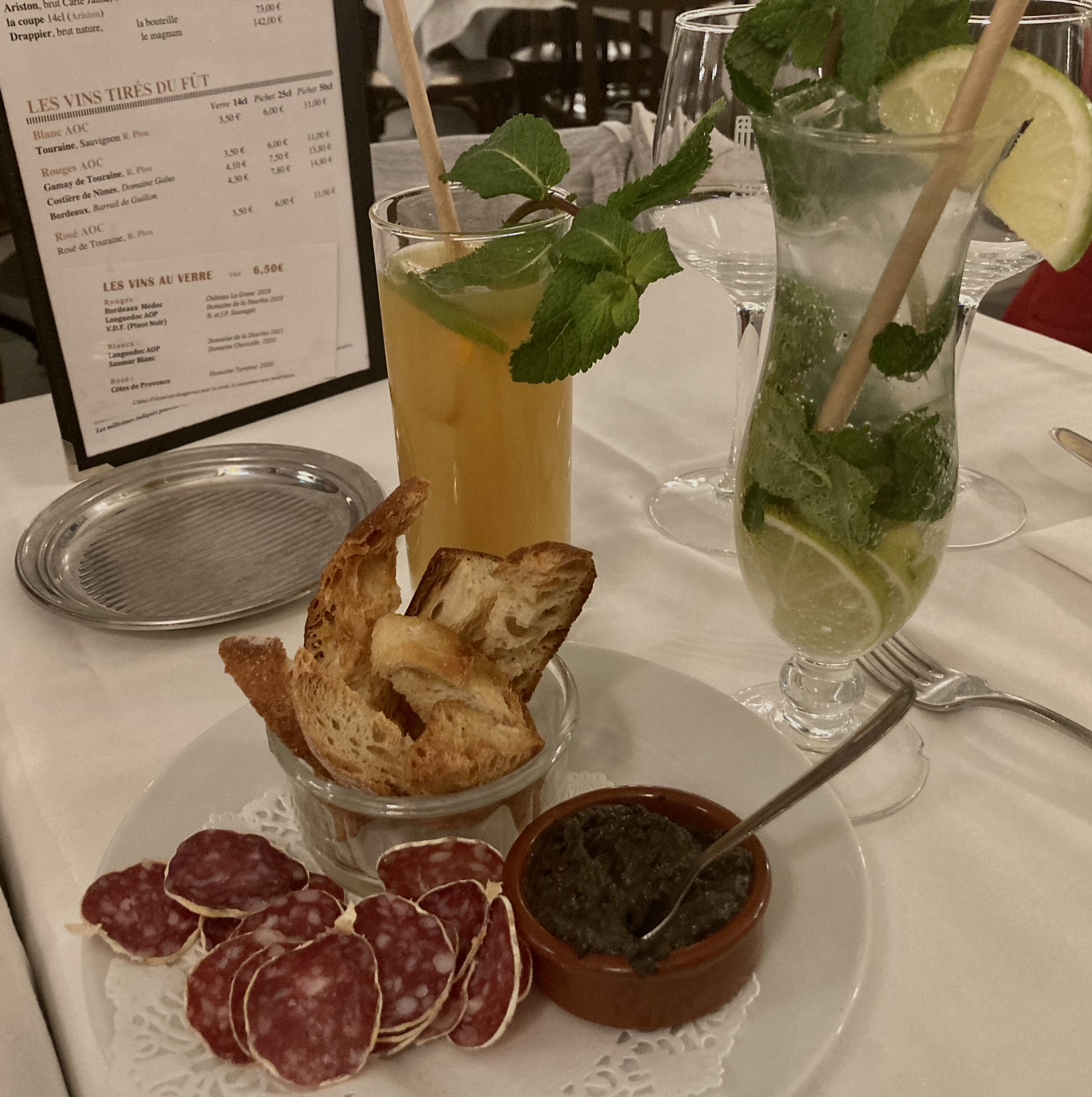 Quelle déception : Malgré une cuisine d'un rapport qualité prix correct, le serveur s'est trouvé bien seul à servir la grande salle du RdC. Le service a donc été long, long, long !!!! Heureusement un aide commis est venu donner un coup de main en fin de service. Autre bémol, victime de son succès ce restaurant est rapidement extrêmement bruyant, et il est bien difficile de pouvoir converser entre convives !! Pour finir, sur la carte est indiquer que les cocktails (11 €) sont présentés avec tapenade ET saucisson, or le cochon n'avait probablement pas été abattu ce soir là. Vous avez un lieu et une réputation à défendre, See you next .