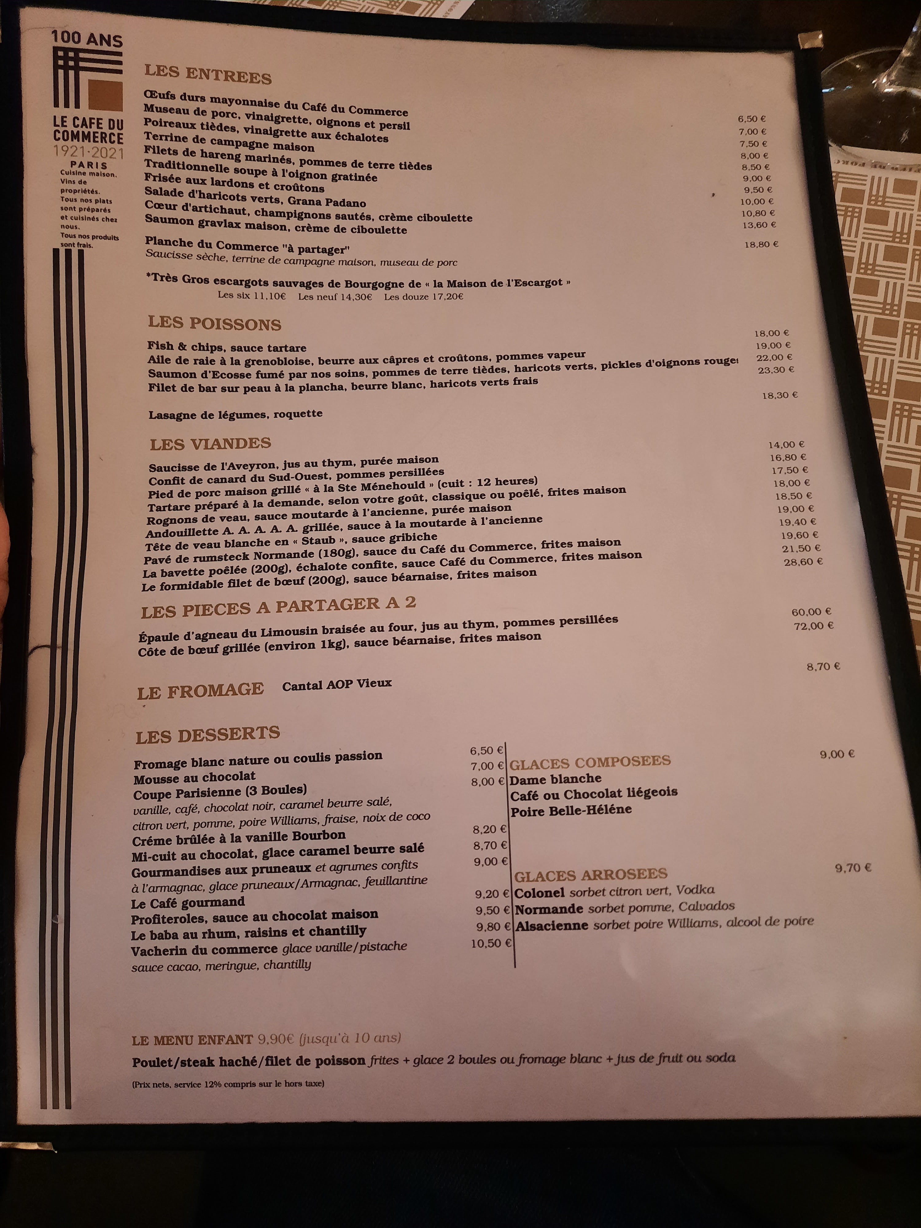 Bonjour, ayant eu l'occasion de venir à plusieurs reprises au café du commerce, et pour le coup toujours apprécié, mais cette fois ci nous étions une table de 9 personnes à l'étage, service déplorable, plein d'erreurs de commande, plein d'erreurs de cuisson, juste à côté de notre table une porte de service qui ne cesse de taper fort (le groom de porte hs sûrement ?) le serveur fatigué et perdu et surtout pas du tout concentré ? Bien triste soirée et les autres invités très déçu également... Et au moment de payer l'addition on nous dis que les cafés sont non inclus au ticket et qu'il faut donc rajouter 17€50 sans aucun ticket complémentaire ???, ou va donc ce complément d'addition ???, Sans parlé de la table à proximité de la nôtre qui avait le même problème que nous... Et Comme on dit, quand c'est bien il faut le dire, mais quand rien ne va aussi... À bon entendeur !