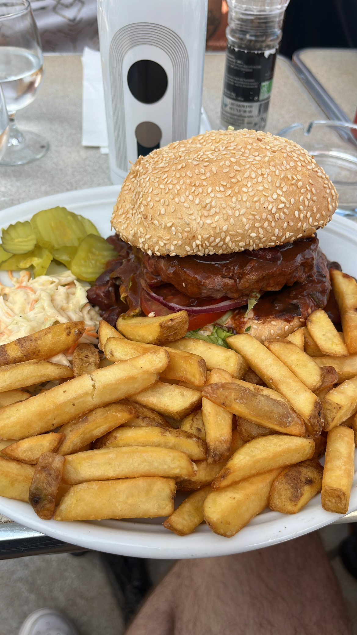 Cadre sympathique en intérieur comme extérieur mais frites surgelées et pas de choix de cuisson du steak haché pour les burgers, pas de sauce maison pour accompagner les frites non plus. Cependant les crêpes sont bonnes. Service approximatif et rapport qualité-prix peu satisfaisant.