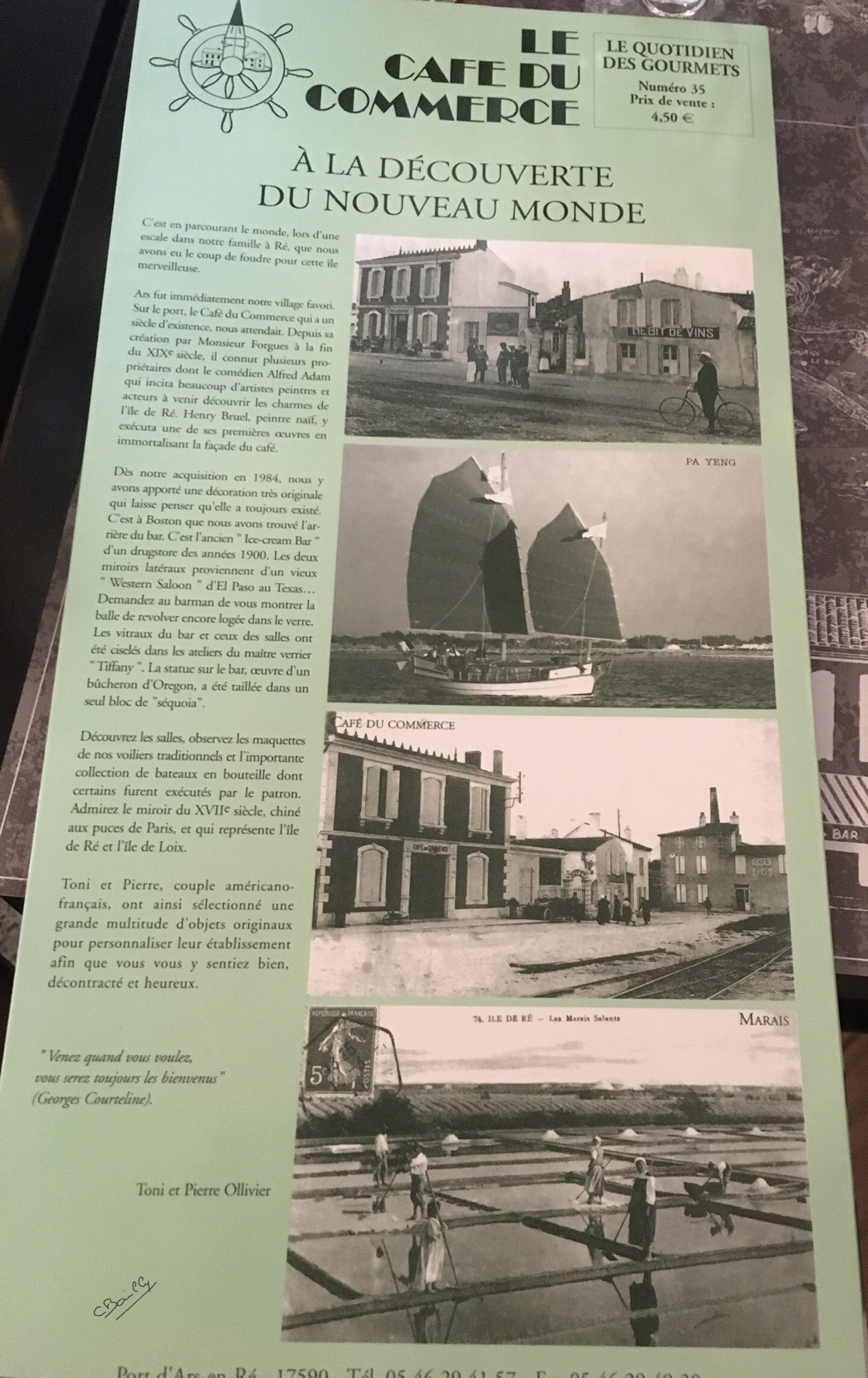 Très beau café restaurant situé au port de Ars en Ré. Accueil sympathique belle et grande terrasse mais surtout l’intérieur vaut le détour avec une magnifique déco. Le mobilier du bar provient de récup aux États Unis les miroirs aussi d’ailleurs sur l’un d’eux on peut encore y voir une balle de revolver restée dans le verre. Côté restaurant c’est une carte type brasserie très grande choix pour un rapport qualité prix raisonnable. A découvrir.