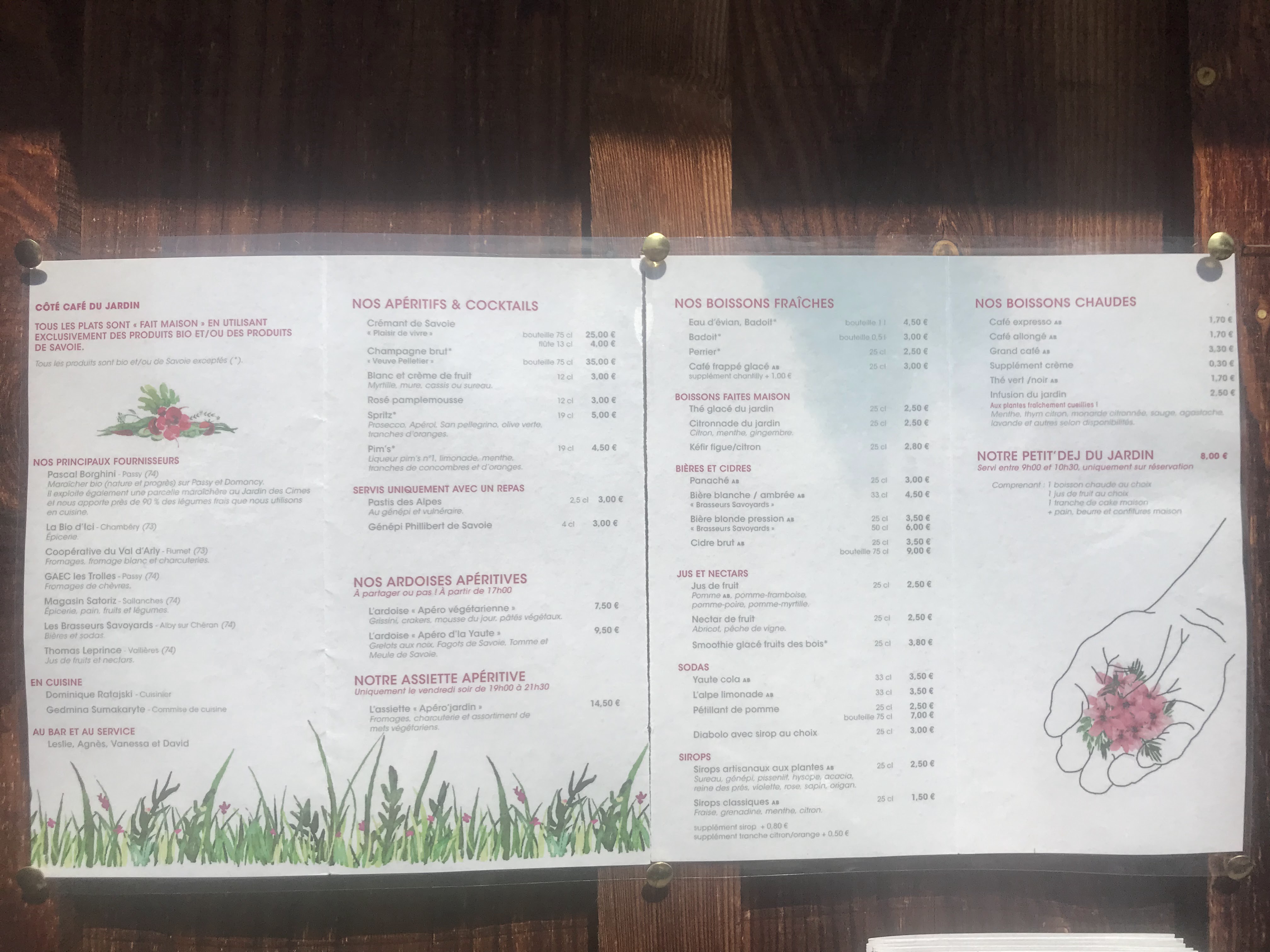 Super découverte de ce lieu au milieu de la nature et au frais avec une superbe vue sur le Mont-Blanc. Carte presque entièrement végétarienne. Le reblochon frit était à tomber par terre mais presque trop petit. Belle découverte des fleurs à déguster. Pour le dessert, nous avons tester la tarte Tatu on et la tarte aux myrtilles, toutes deux très bonnes.