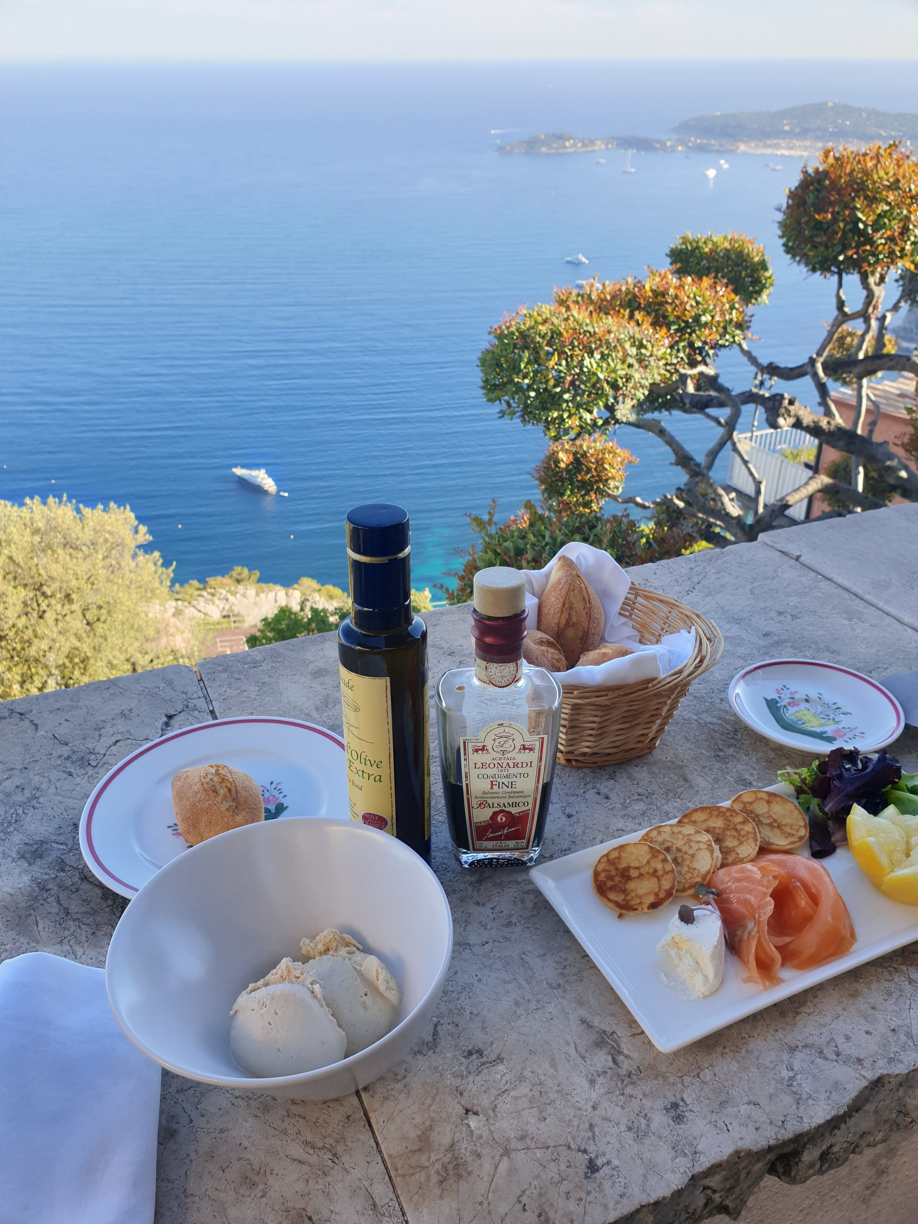 Vue vraiment exceptionnelle, ça vaut bien des prix élevés de tapas et cocktails de qualité, dessert excellent, au sein du palace de la Chèvre d’or. Une très belle soirée, merci