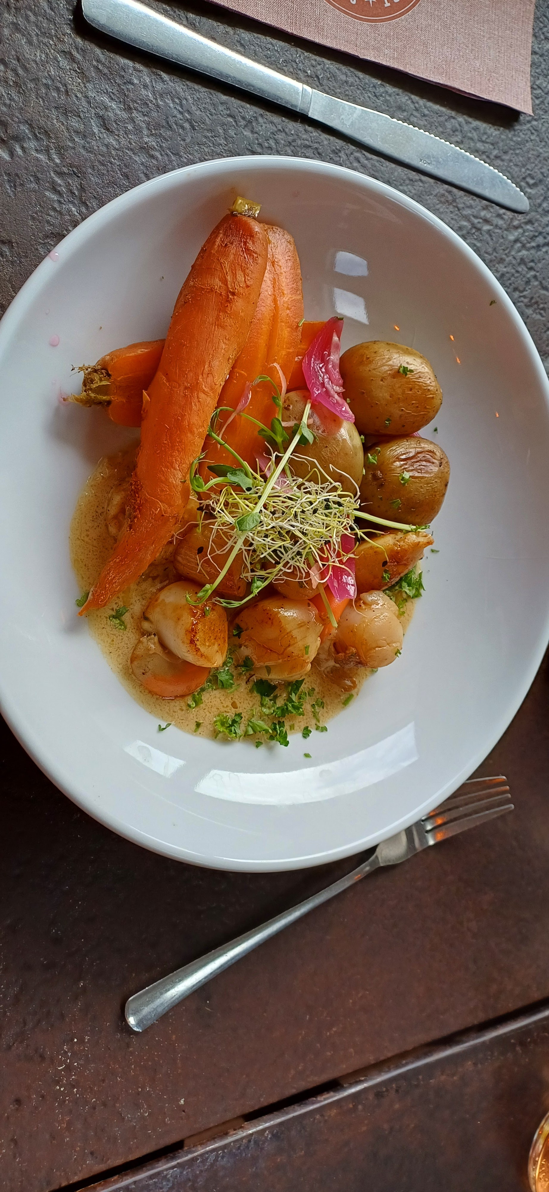 Très bon plat. Noix de St Jacques avec du riz et carottes rôties. Excellent repas