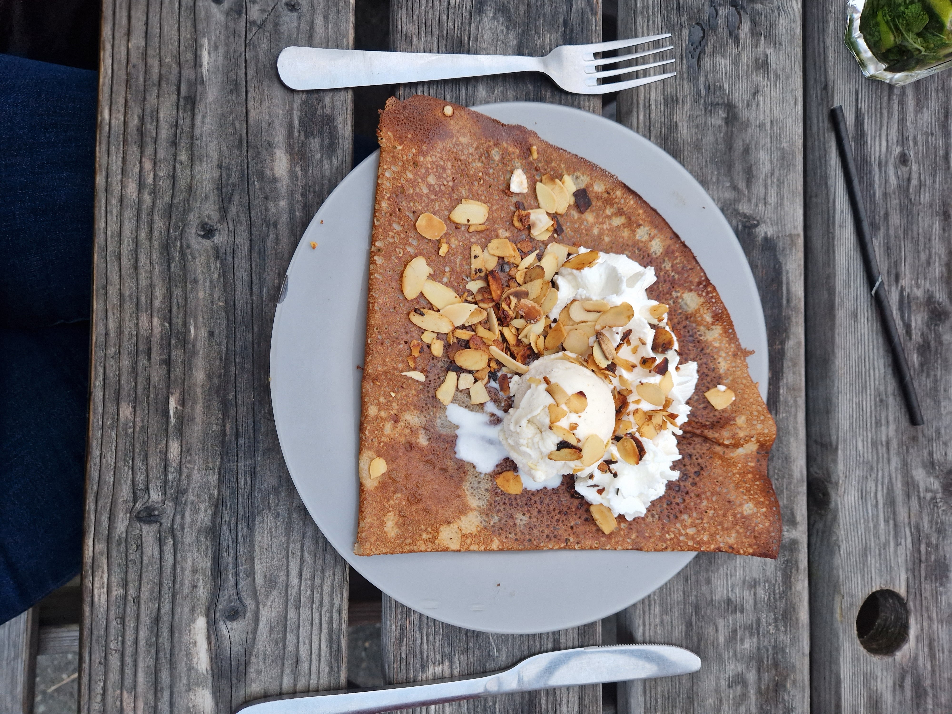 Pour une petite halte sucrée avec vue sur le port de Locquémeau, c'est parfait ! Le combo crêpe sucrée et cidre artisanal local est bien apprécié !