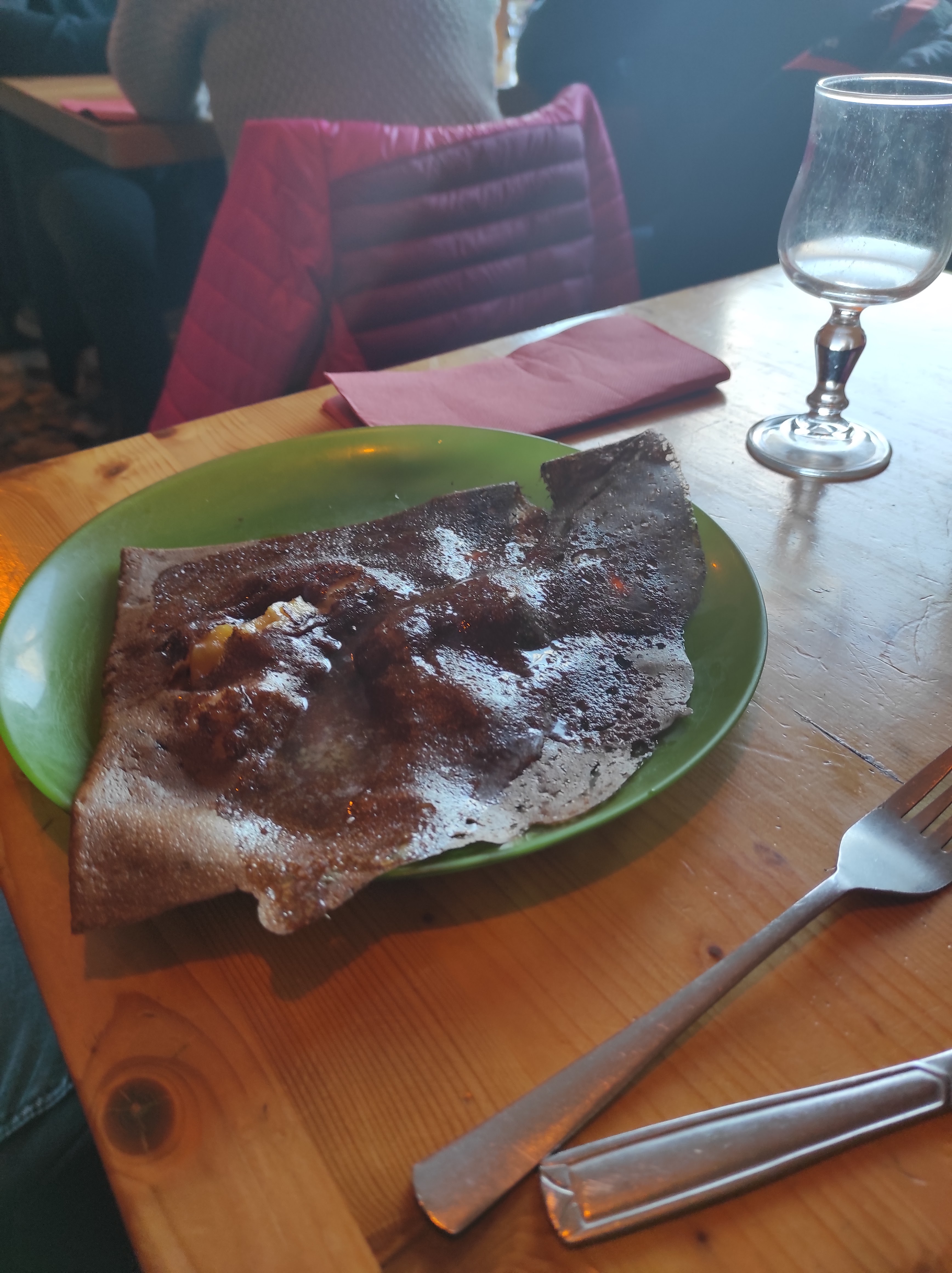 N'y allez pas pour manger tranquilles ! Ce qui marque, c'est cette horrible et insupportable musique trop forte et pourtant non identifiable, qui rend l'ambiance générale assourdissante. Musique de fond ? Non, bruit de fond à l'étage, une espèce de zinzin qui pousse vers la sortie au plus vite. Le ton monte pour essayer de s'entendre à une table de 4. Les autres en font autant, le bruit engendrant le bruit. A part la galette bien amputée qu'on a osé servir, on en oublie ce que l'on a mangé. Comme dirait l'autre, c'était mieux avant !