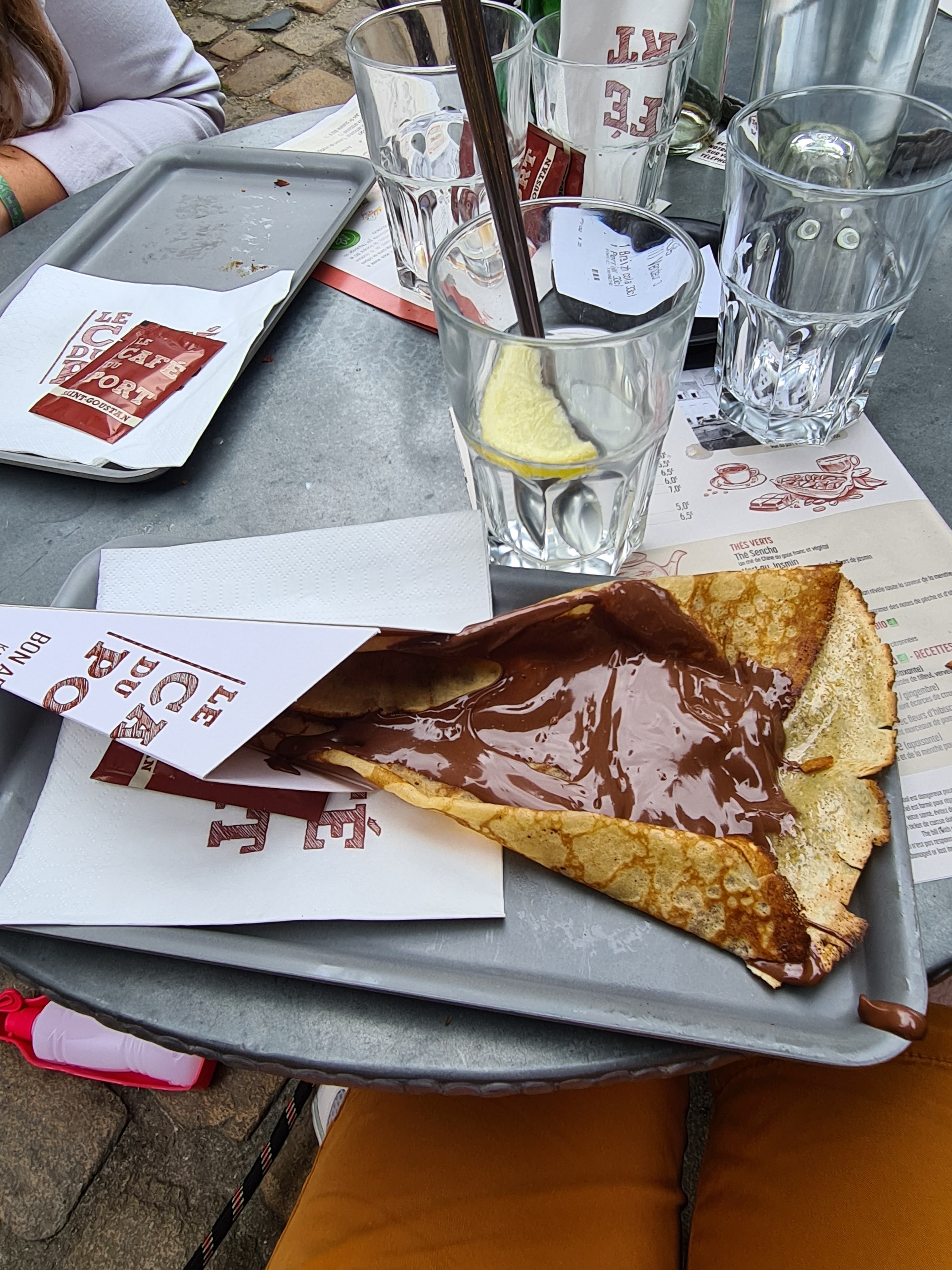 Merci, mais non merci. Restaurant l'annexe du port: Thé glacé et citronnade maison, on cherche encore le goût (un grand verre d'eau avec des glaçons et une rondelle d'orange...) Les crêpes sont TRÈS grasses et TRÈS SÈCHES servis dans des cornets en carton avec des couverts en bois, alors qu'au café du port il y a des vrais assiettes et des vrais couverts en inox. Pourquoi tant de différence de traitement ??. Si c'est pour jouer la carte écolo commencer par éteindre les lumières en terrasse (à midi). MAIS malgré tout les 2 petites serveuses (sûrement en extra) étaient très sympathiques et souriantes. Une bonne note pour les gamelles d'eaux pour les toutous à l'entrée. Très bon emplacement.