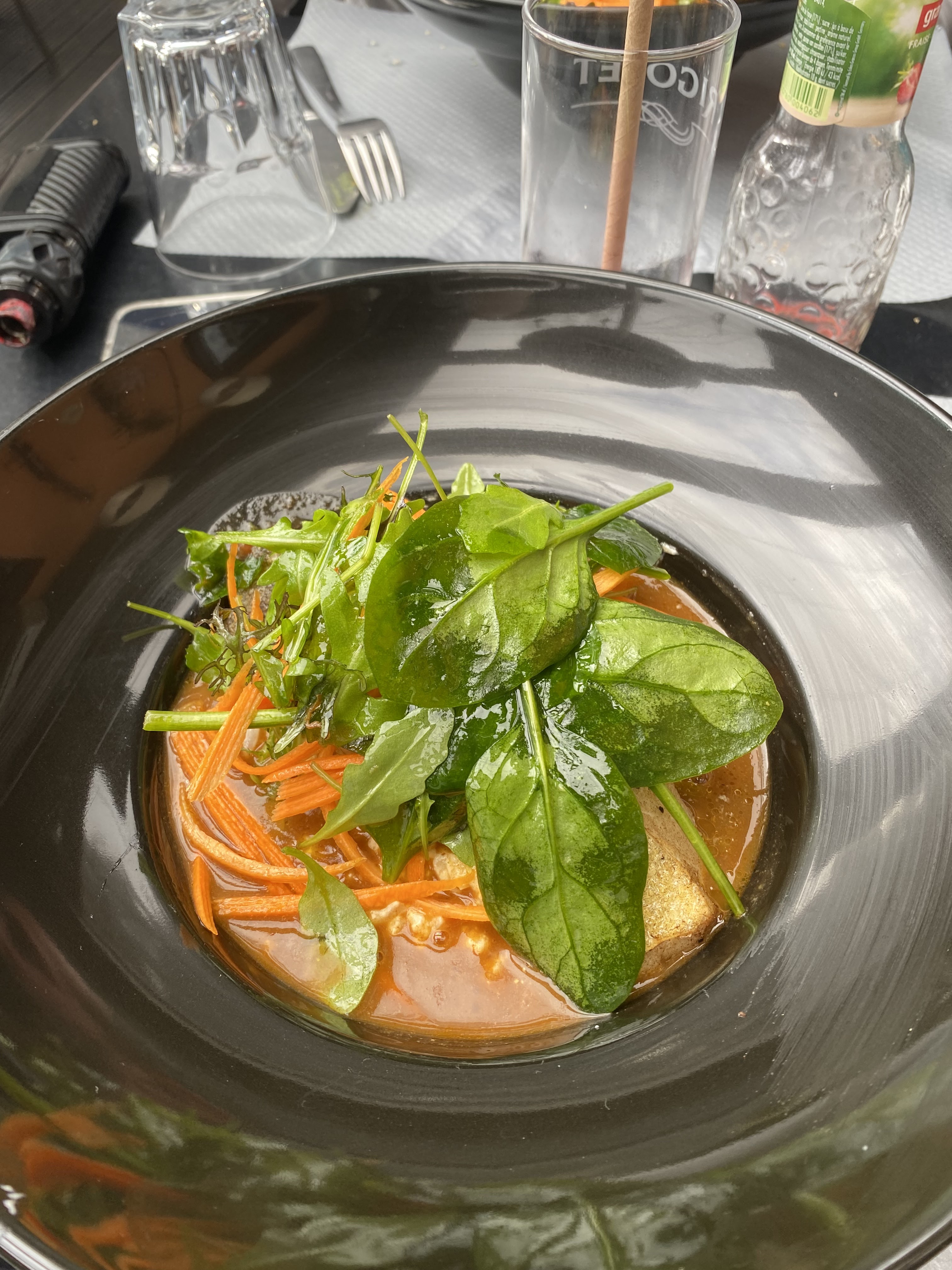 Délicieux déjeuner en terrasse. Cuisine mêlant avec justesse les produits simples et les épices. Bon rapport qualité prix. Service efficace. Bref rien à dire à part MIAM ! pour mettre l''eau à la bouche : Soupe froide de courgette à tomber. Moelleux de thon trop bon. Poulet façon tandorii très juste et gourmand avec une polenta assortie d' une sauce parfumée à souhait