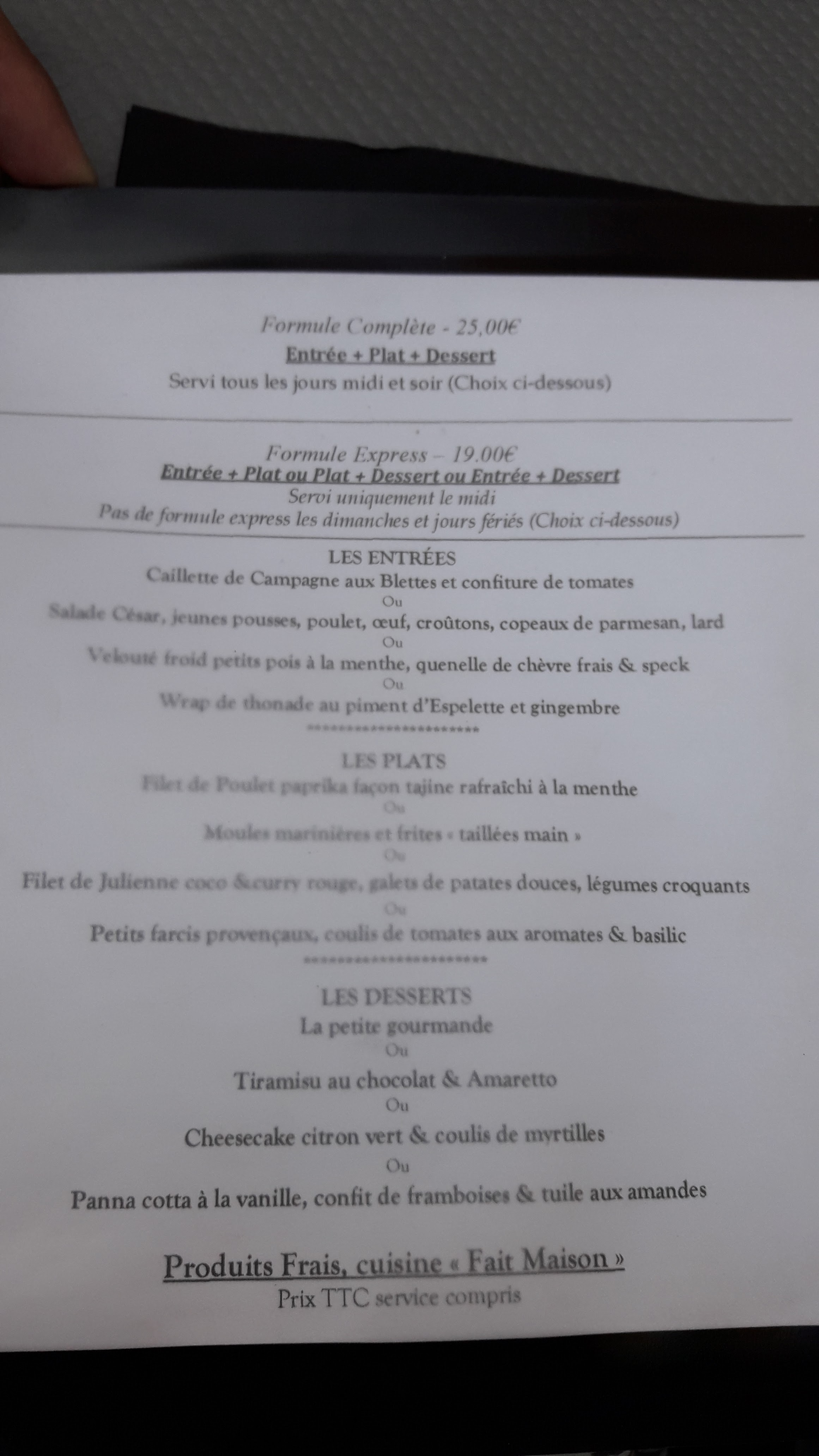 Menu 19€ entré, plat, dessert. Tout était excellent. Bravo au chef, également accueil très agréable, comme les serveuses. Allez-y vous ne serez pas déçus