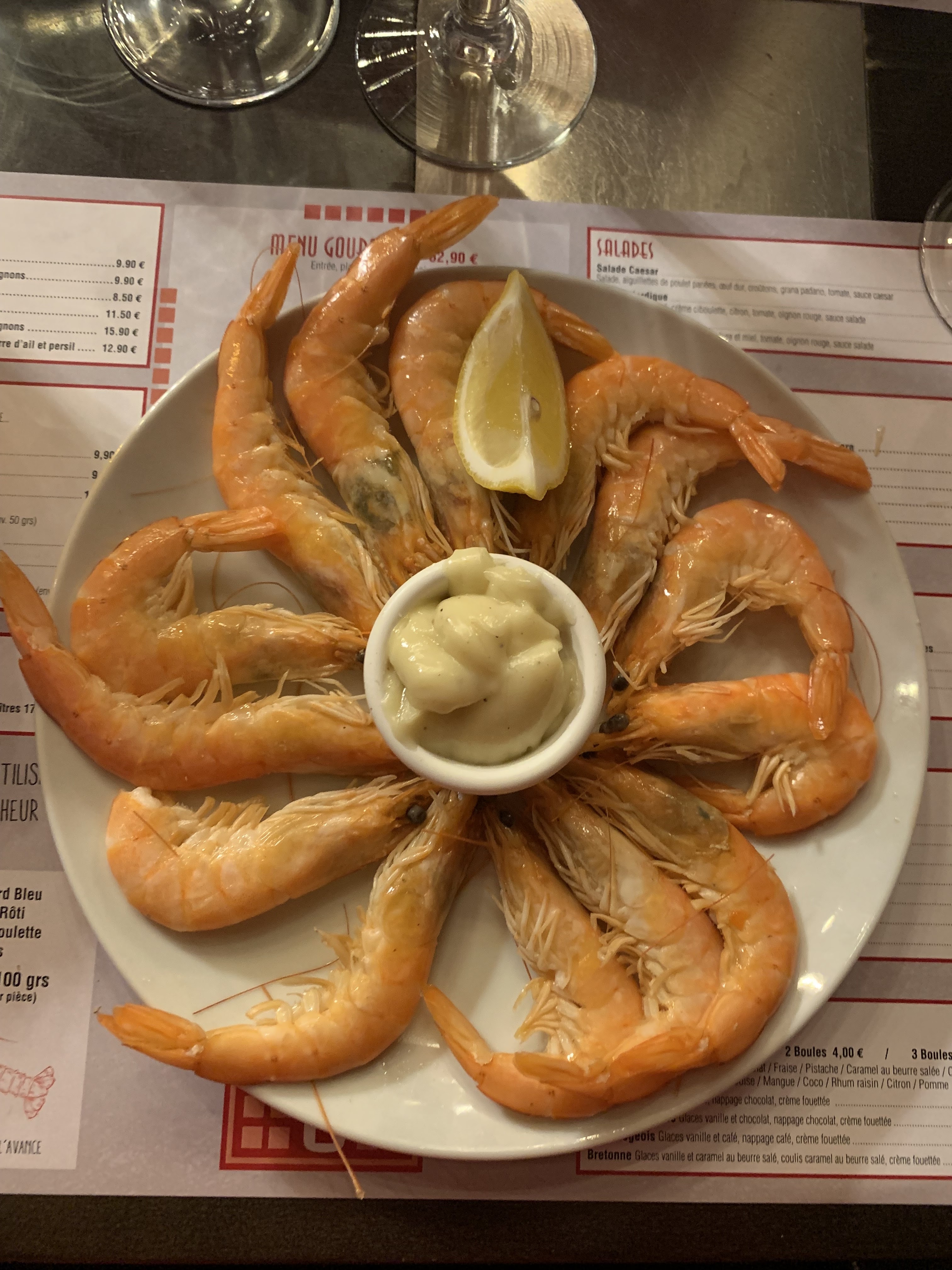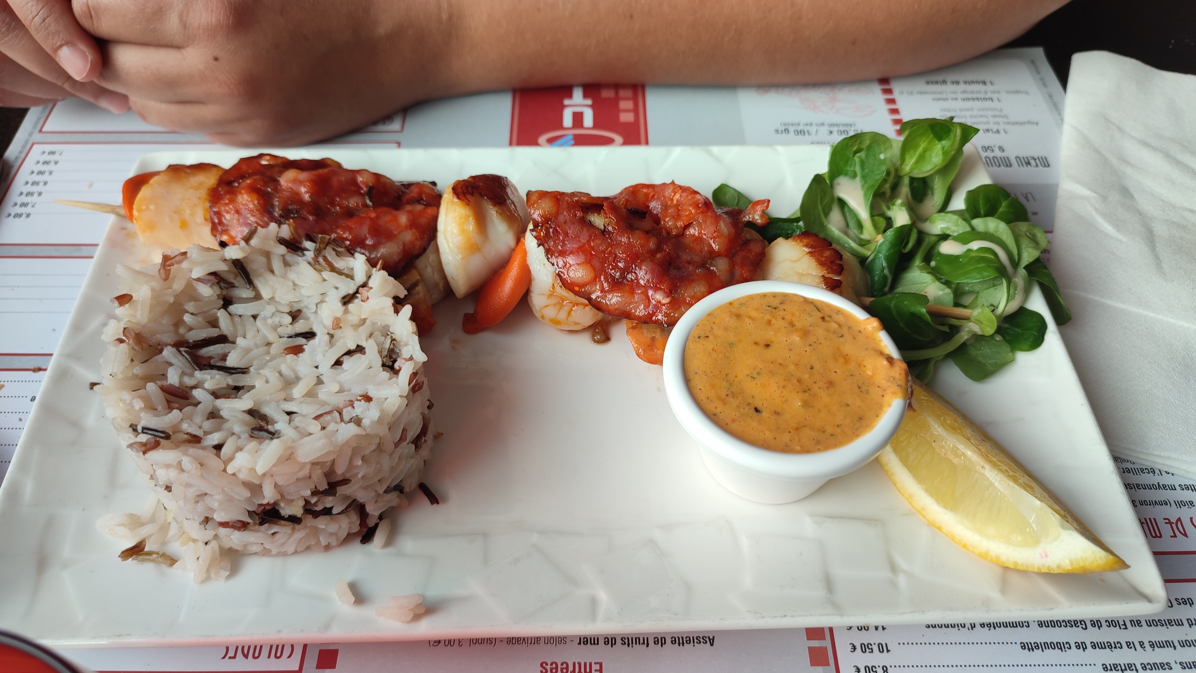 J'ai pris un menu gourmand à 30 euros avec assiette de fruits de mer en entrée et gambas grillées en plat, cela était très bon. Et le service était certes un peu lent mais très correct.