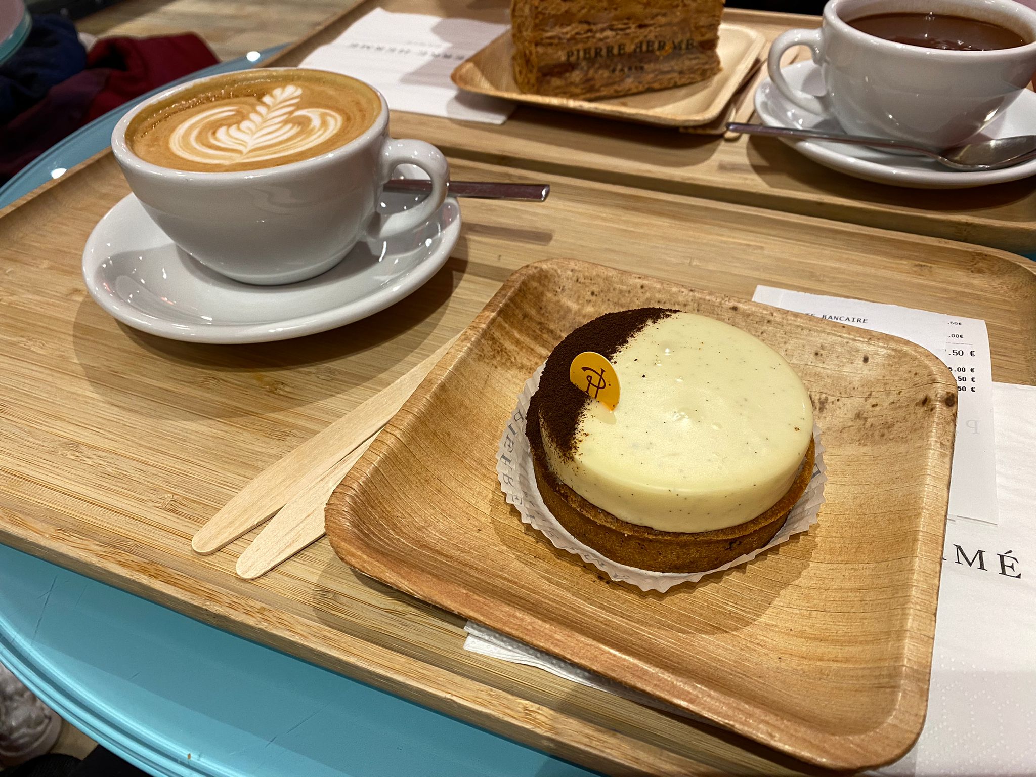 Nous connaissons déjà les produits Pierre Hermé et de passage dans le quartier, nous étions à la recherche d'un lieu pour une pause gourmande. Malgré le choix très limité en pâtisseries, nous avons pris les 2 variétés de gâteaux qui restaient et n'avons pas été déçus. Par contre, je ne comprends pas le choix des couverts. Service assez improbable des boissons chaudes dans des tasses en porcelaine et du reste dans de la vaisselle jetable. Les assiettes et les couverts ont beau être dans des matières naturelles et sans plastique (volonté de se donner bonne conscience écologique? ), cela reste un gaspillage et une pollution énorme pour de la consommation sur place. En plus, les couverts en bois ou bambou (?) ont un goût désagréable et gênant au moment de la dégustation, au point que j'ai fini par utiliser la cuillère de mon capuccino.