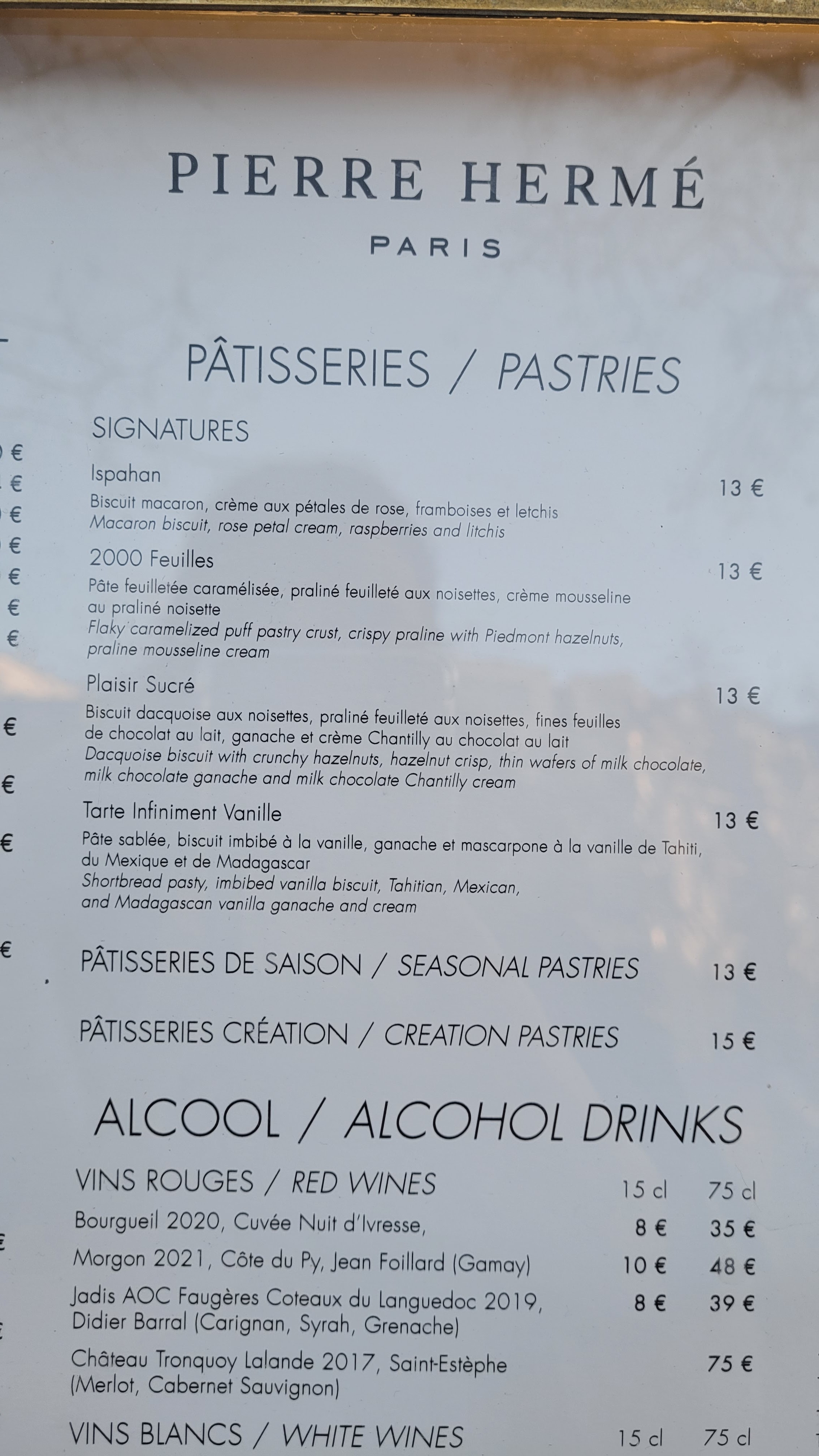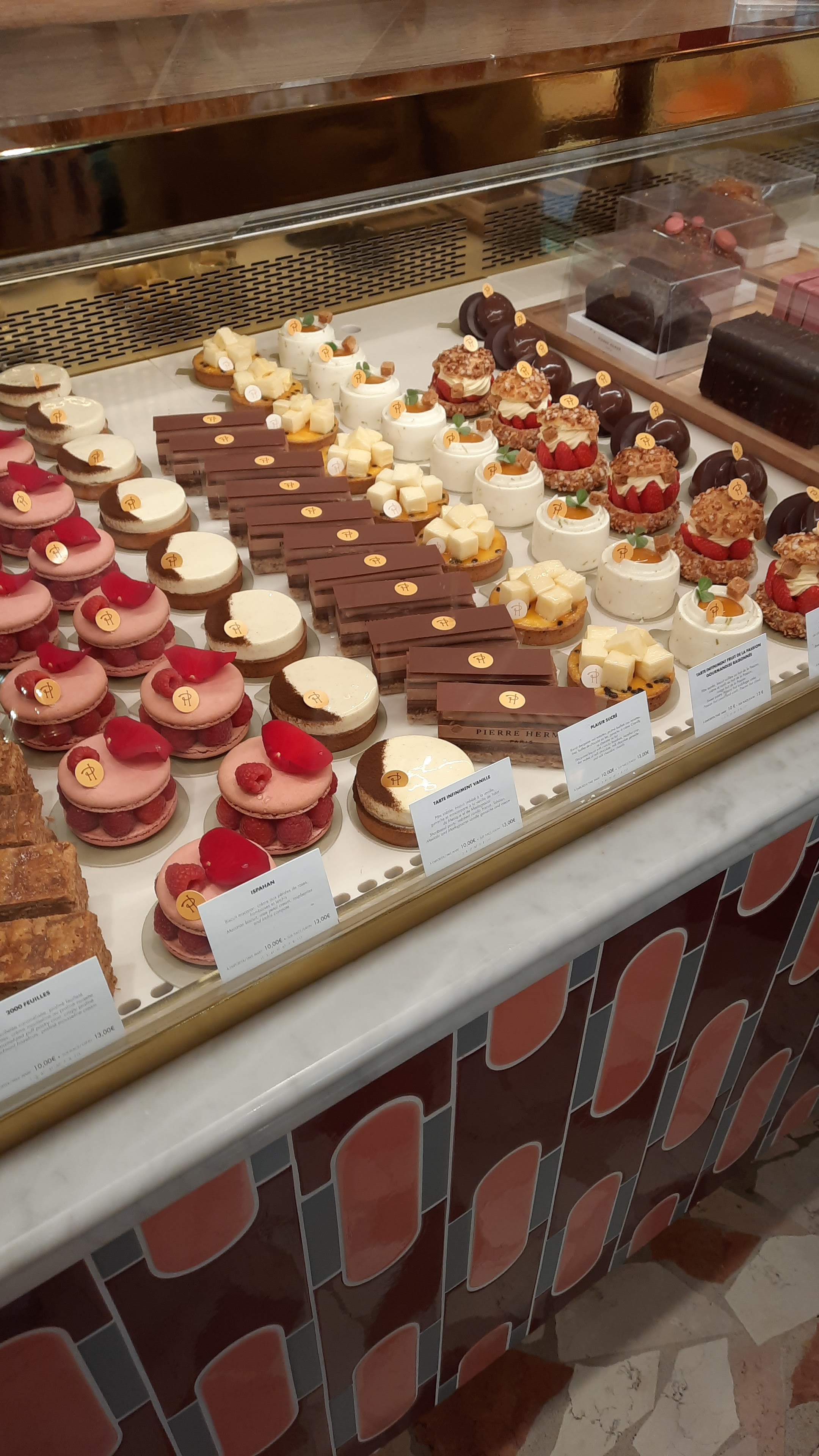 Les pâtisseries signées Pierre Hermé sont vraiment impeccables. On peut apprécier la recherche derrière toutes ses recettes et la haute qualité des ingrédients. Les desserts en portion individuelle sont chers (13€ sur place) mais valent chaque centime de leur prix. Le plaisir sucré au chocolat est un vrai régal, l' ispahan à la rose et framboises, signature du pâtissier, est époustouflant; le millefeuille est un peu trop sucré à mon goût. Les macarons sont intéressants mais classiques et un peu trop chers (3,20€ sur place). Excellent service, surtout de la part de la jeune fille italienne.
