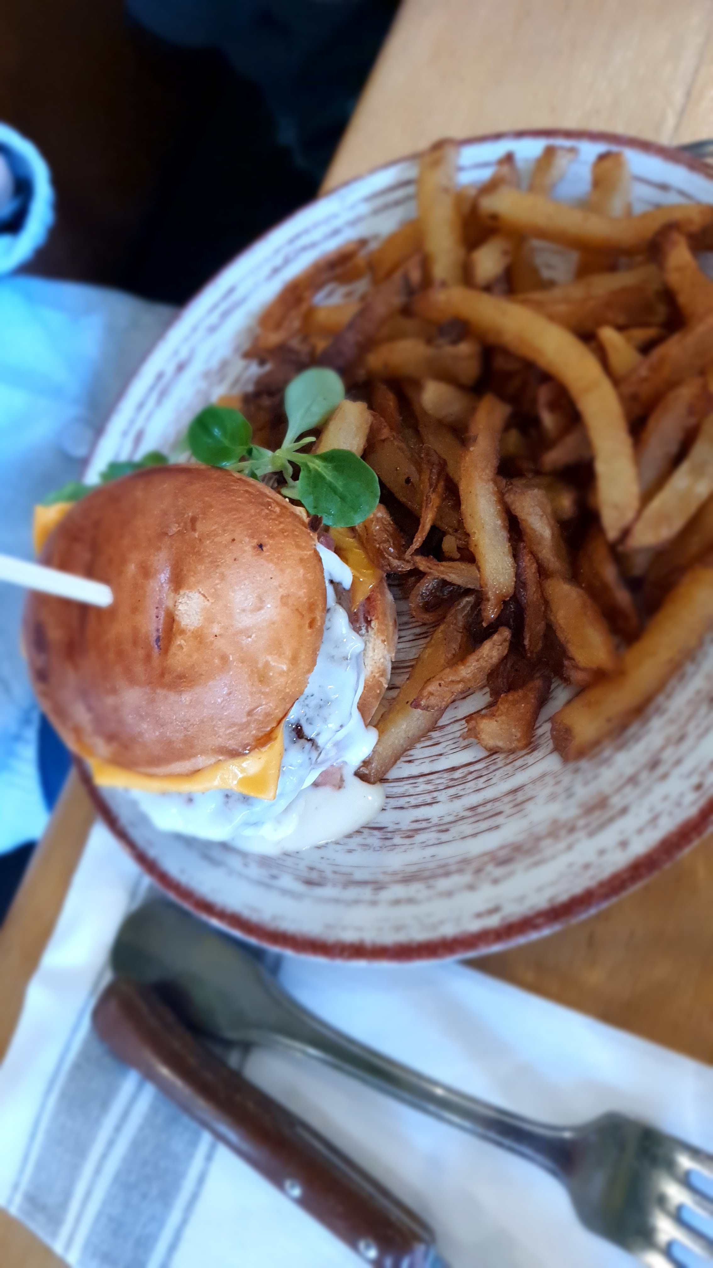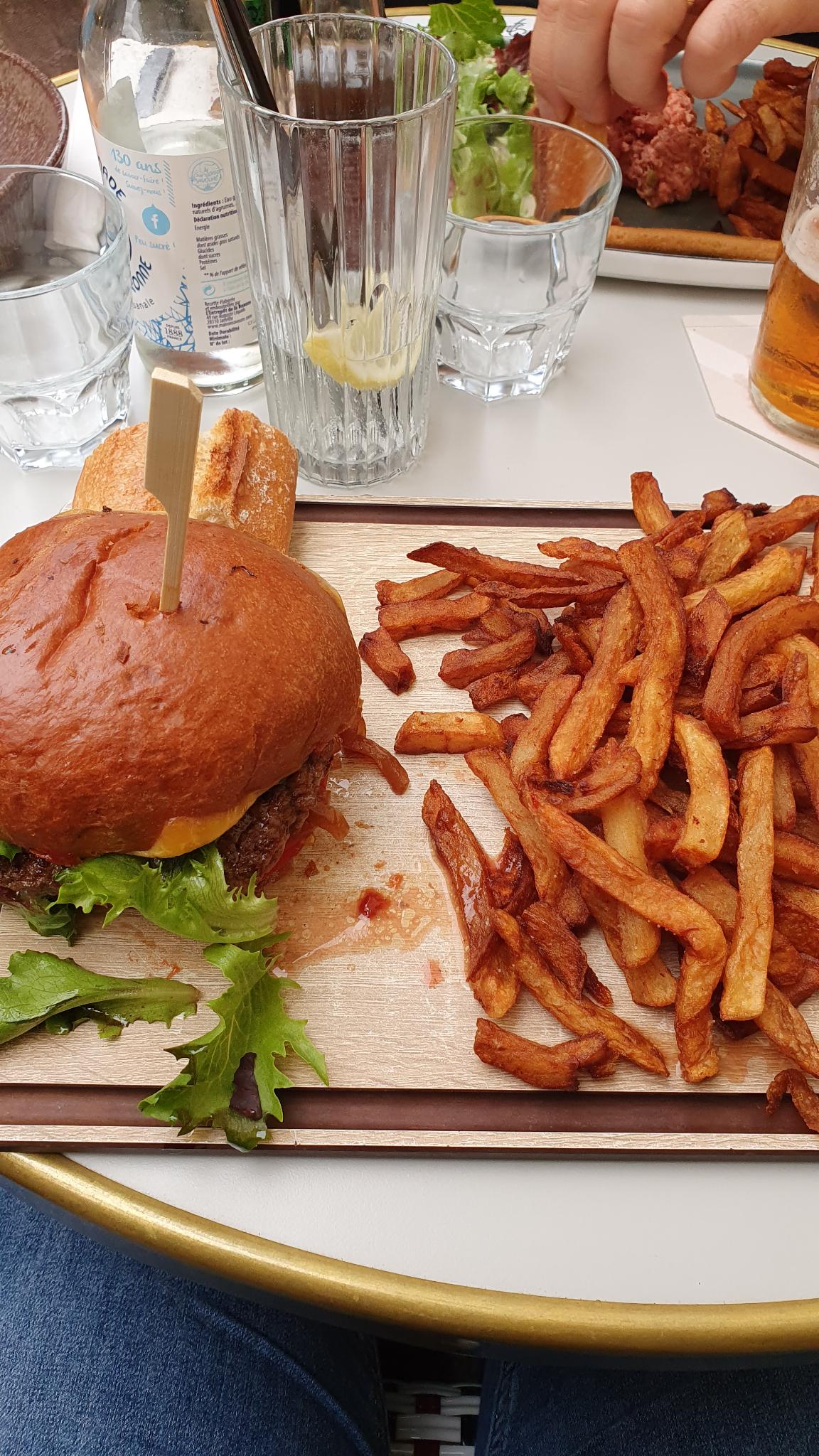 Burger auvergnat très moyen, pain de mie froid, frites à vous casser les dents. Personnel sympathique mais service un peu cantine. En raison d'une fréquentation imprévue, on vous annonce pas de pain pour l'instant au moment d'en réclamer...après la commande. La clientèle s'est rabattue sur ce restaurant par manque de place ailleurs, comme c'était mon cas (il vaut mieux penser à réserver là où vous voulez vraiment dîner) Je reconnais que la tarte fine aux filets de rougets en entrée était correcte.