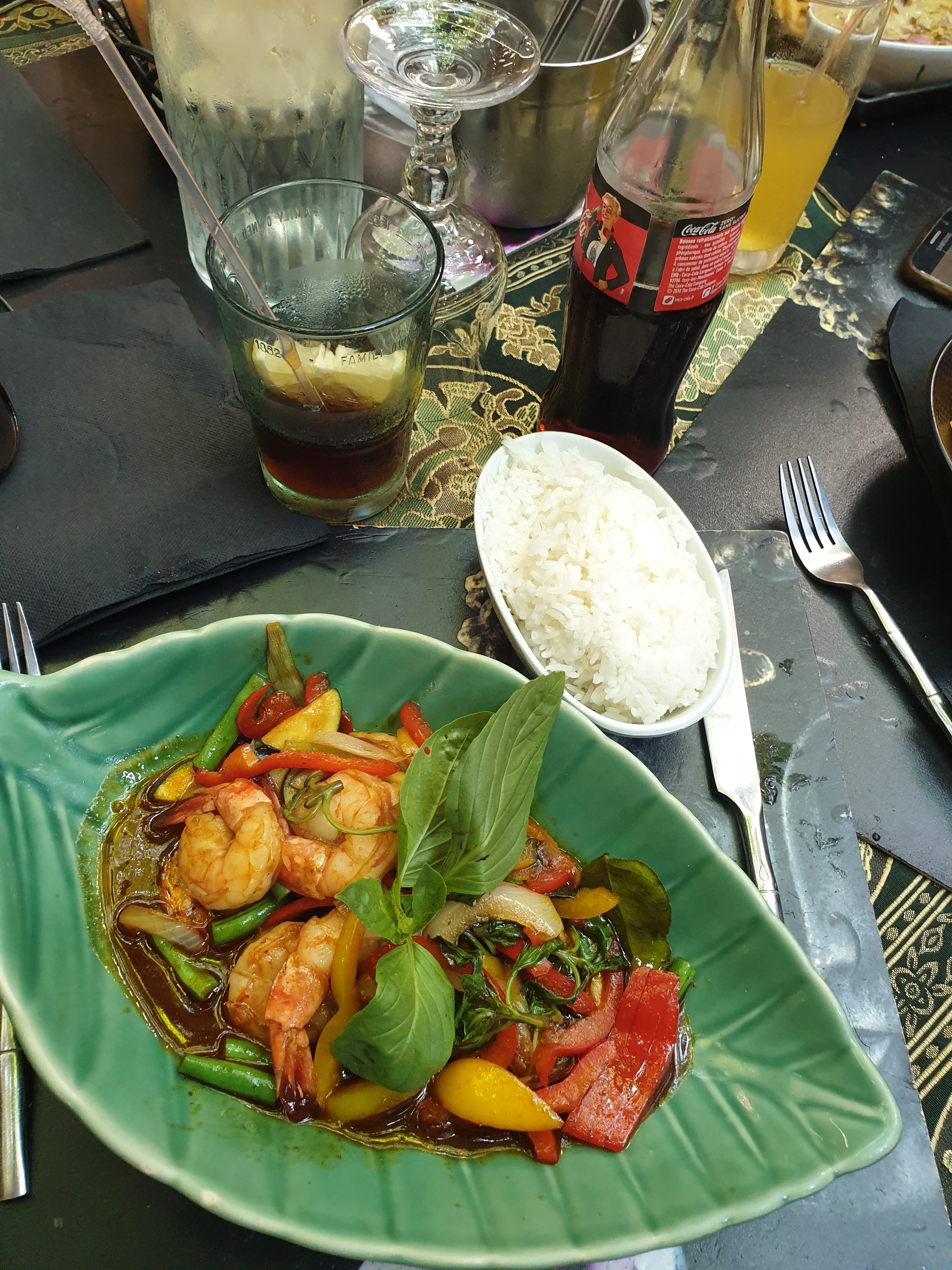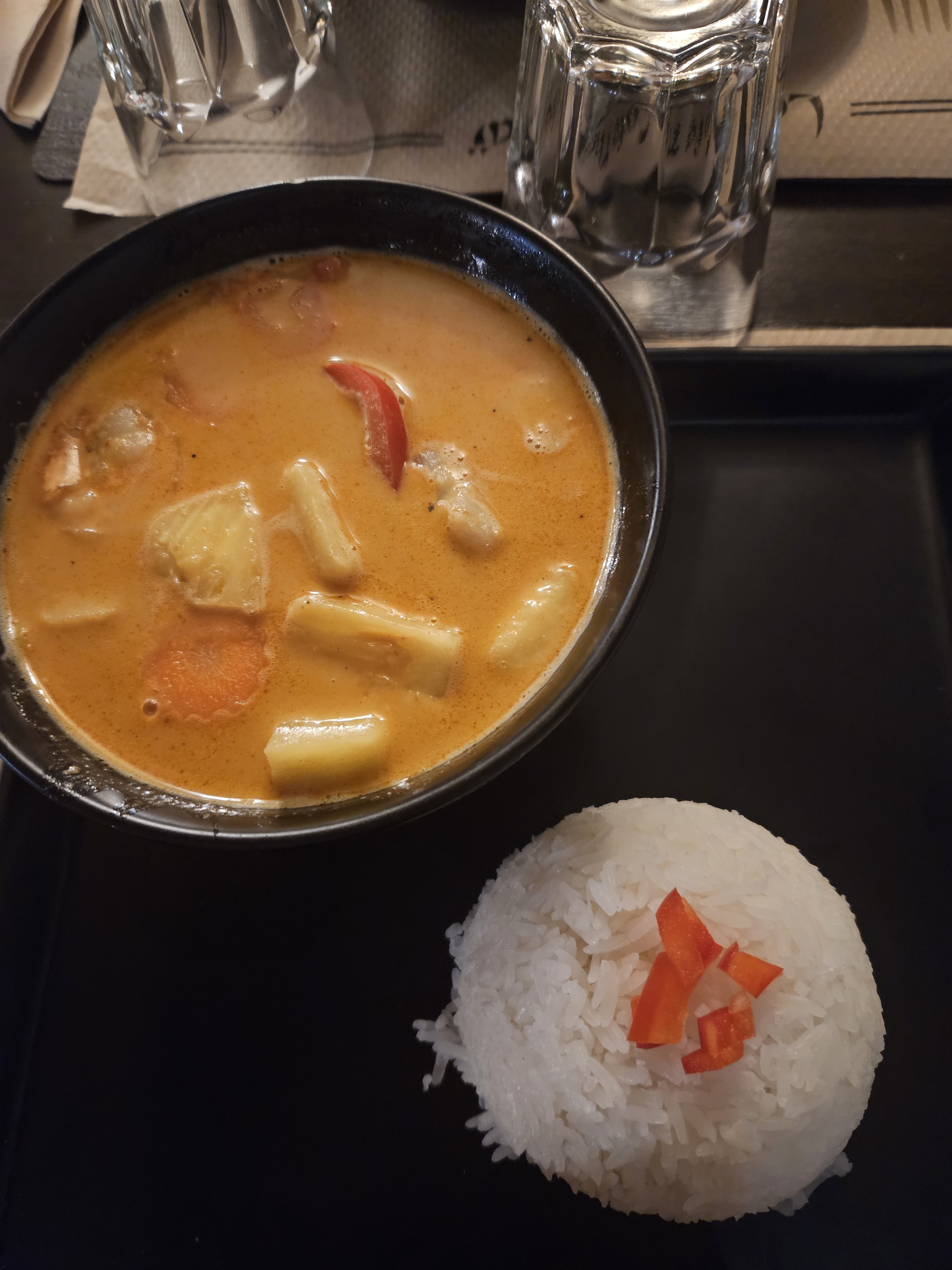 Acceuil super comme d habitude Très bon cocktails La nourriture est excellent Le curry rouge de crevettes est tout simplement délicieux Possibilité de demander plus ou moins épicé Et de manger français si vous accompagné vos amis qui aiment manger thaï À faire et refaire!!!!!!