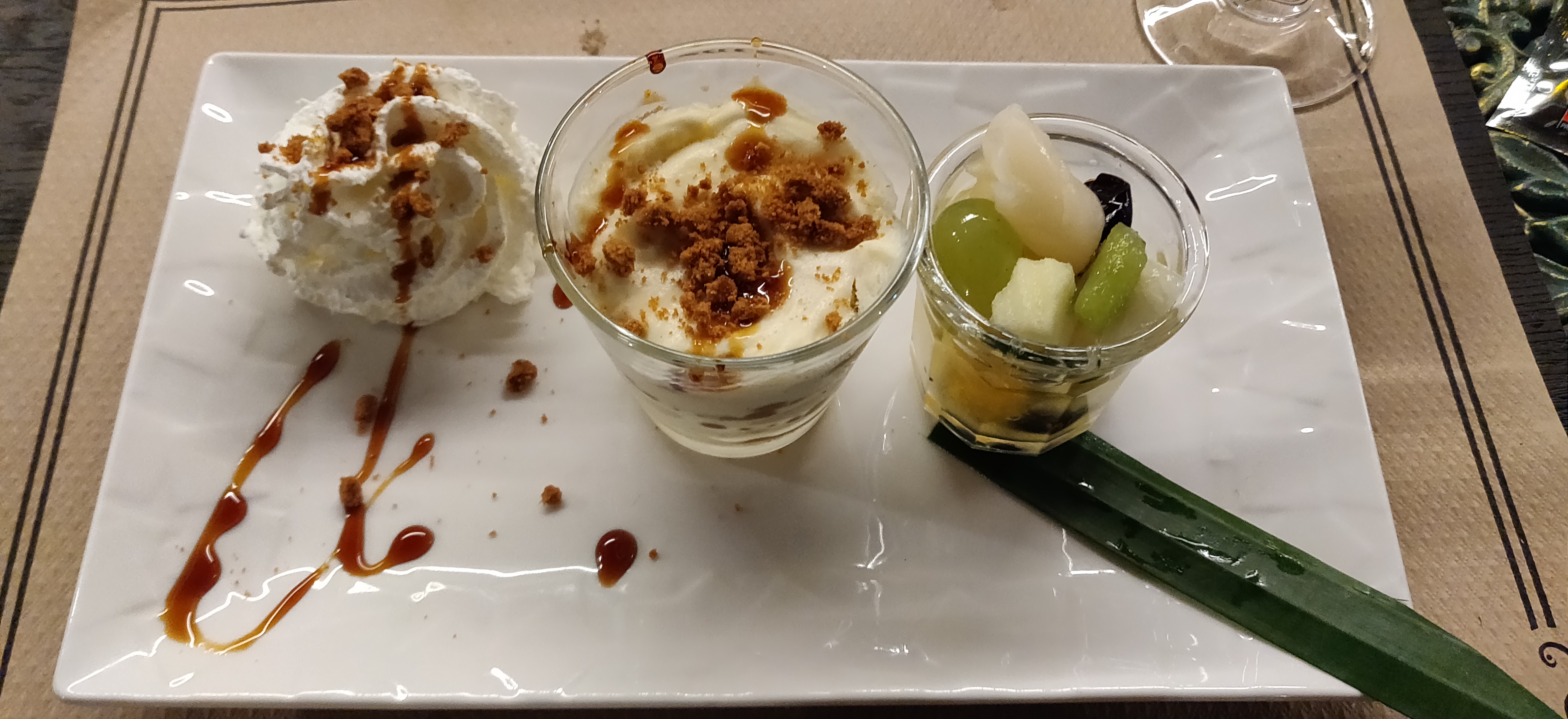 Déjeuner dans le patio, un peu bruyant. Nous sommes accueillis par une serveuse, blonde coiffée avec une queu de cheval, elle se reconnaîtra, survoltée et qui m'a hurlé dessus, la moitié du restaurant a beneficié de ses cordes vocales, parce que je lui ai fait part que la table attribuée , l'emplacement ne correspondait à celui que j'avais demandé lors de la réservation faite bien avance A part cet incident tout c est bien déroulé avec le reste du personnel aux petits soins.
