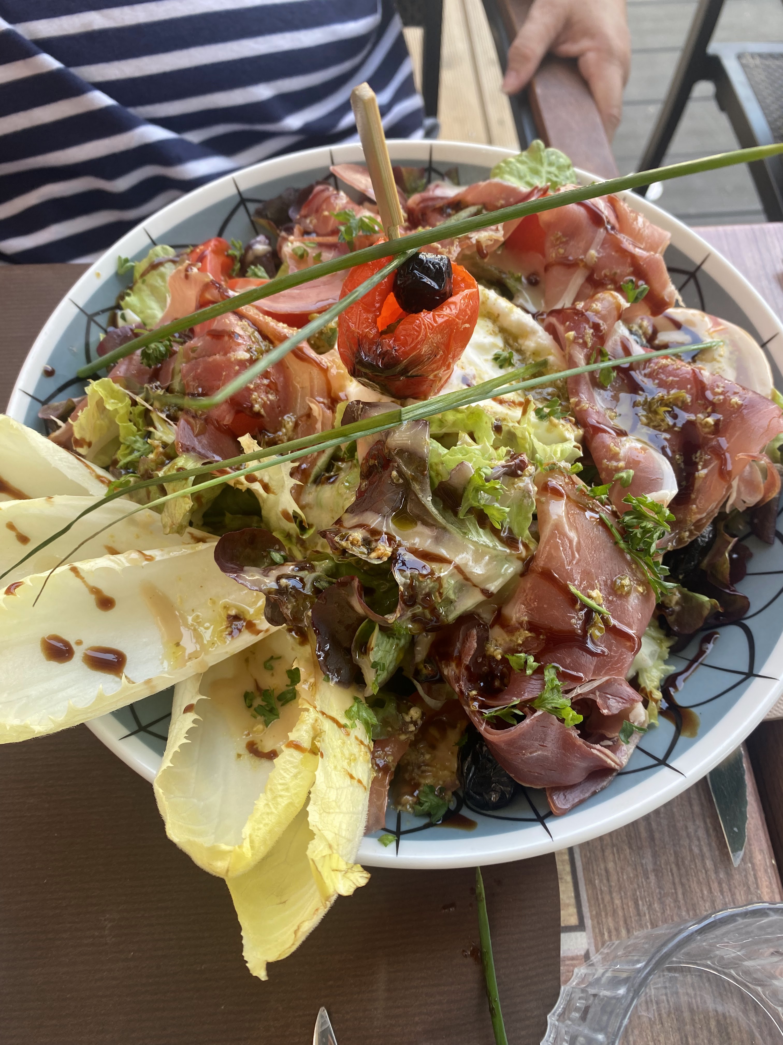 Nous avons eu l'impression d'avoir été oublié sur notre terrasse Nous avons dû demander 3 fois de l'eau. Pas de pain. Longue attente. Proscetto éventé .