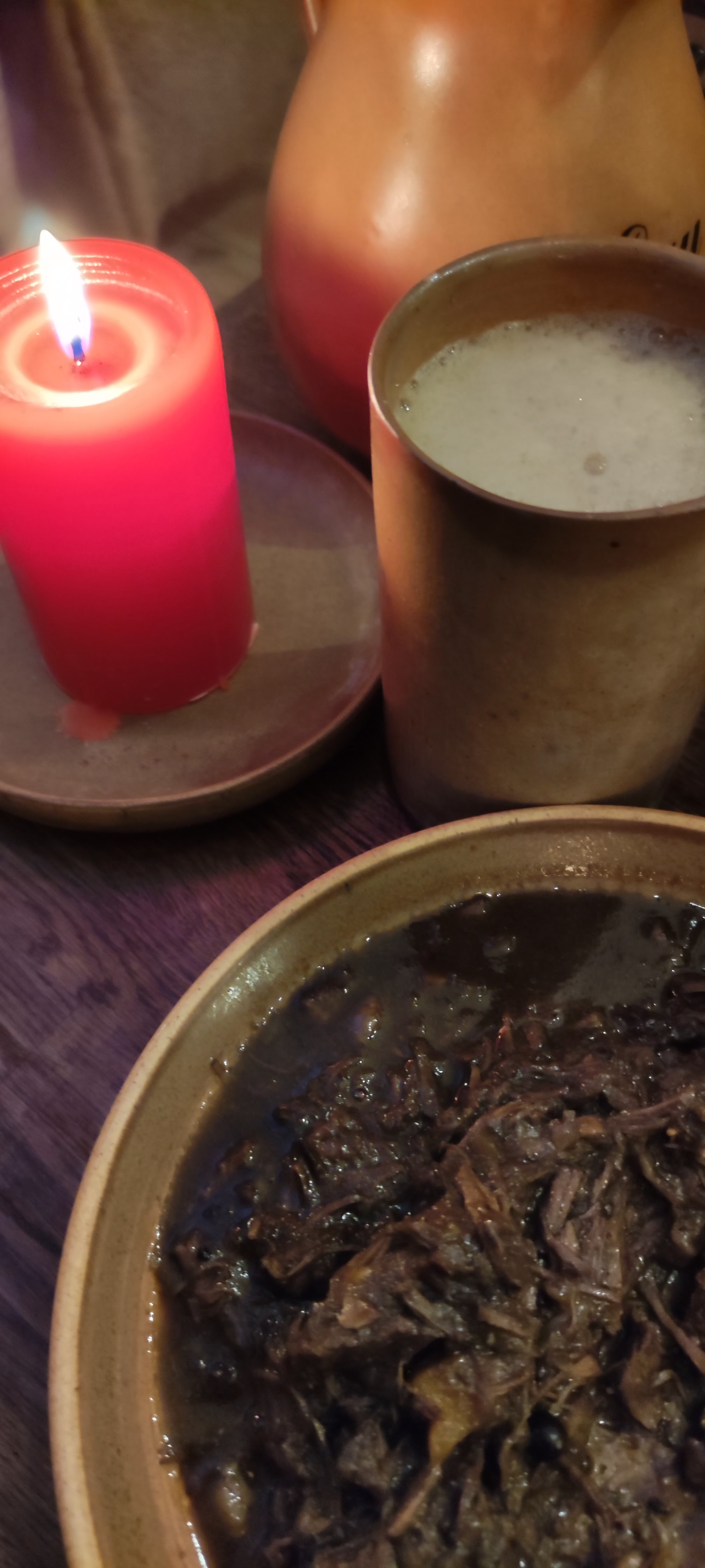 Que dire... L'entrée dans la taverne est déjà une aventure en soit, tout est agencé parfaitement pour titiller l'envie de découvrir ce qu'il se cache sur chaque étagère, l'autel à la Déesse resplendit au centre du mur, les flacons, les fioles, les livres, le décor est posé et bien posé ! Ensuite on tombe sur Eva et Michel, l'aventure continue en leur compagnie, ils sont parfait dans leur rôle d'hôtes et de taverniers, ils sauront vous faire sentir de la famille, aucun doute là dessus ! Et si jamais vous hésitez encore, regardez le menu, les boissons (tisane spéciale de la sorcière concoctée par Eva, alcool locaux et authentiques ou que sais je encore !), les mets proposés, vous en prendrez, reprendrez et reviendrez avec le même sourire béat que lorsque vous avez découvert le lieu. Et n'oubliez pas leur soirée à thèmes. Nous c'était Viking ce soir, un conteur, des convives agréables et des hôtes au top toujours (merci Roman aussi !) Et olalala la nourriture, un délice. Ai-je oublié les après midi thématiques ? Mais oui ! Cet après midi, nous avons fait un voyage chamanique et une session de paroles par la suite avec Justine Lhabitant, c'était une expérience magique et tellement agréable. Eva nous aura même apporté une tisane froide de sa conception ainsi qu'une succulente pâtisserie. Je finirai par dire : le tailli c'est avec du miel, bordel ! Et à ceux qui ont lu jusqu'ici, allez y, ça vaut le détour et vous ne pourrez qu'être conquis, comme je l'ai été. Merci au Calice Enchanté et à bientôt !