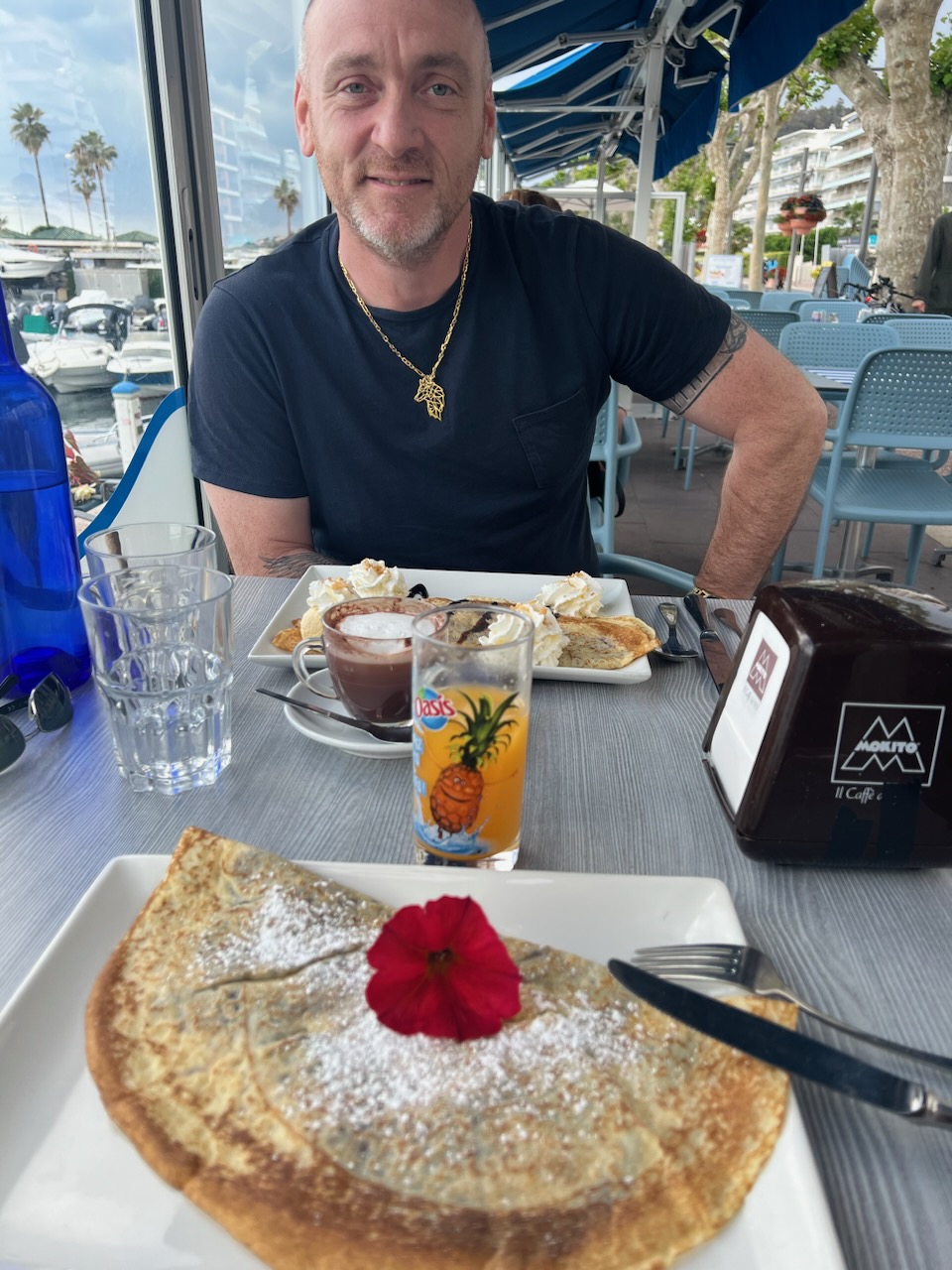 Super vue sur le port de golfe Juan, un serveur beaucoup plus souriant que le commandant Cousteau, une cuisine simple et agréable, que demander de mieux! PS les sardines grillées étaient top!!
