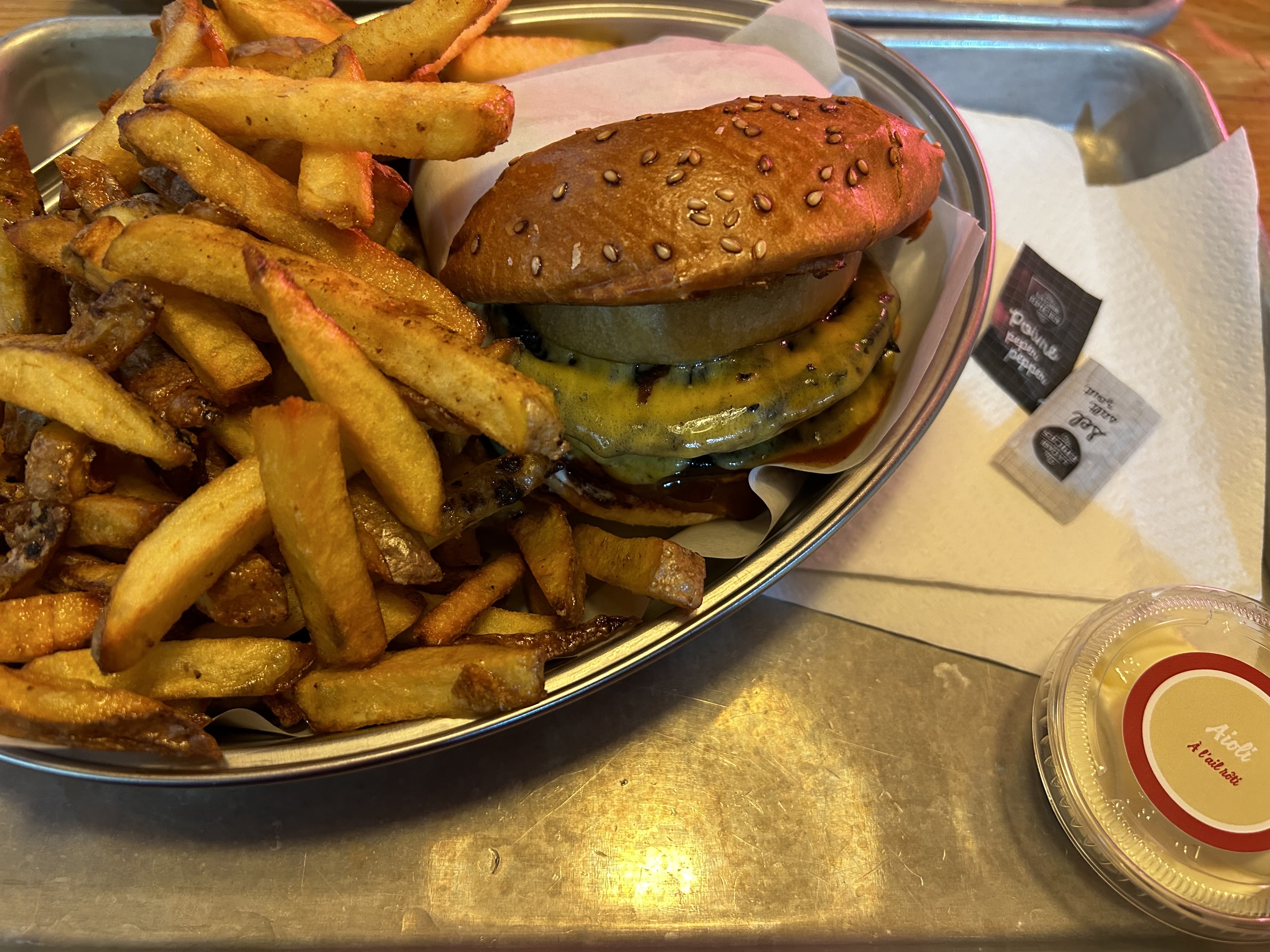 La viande est délicieuse, le pain aussi, mais le reste des portions sont peu généreuses, et les frites sont légèrement trop cuites avec un début de goût de brûlé. Le rapport qualité-prix est décevant.