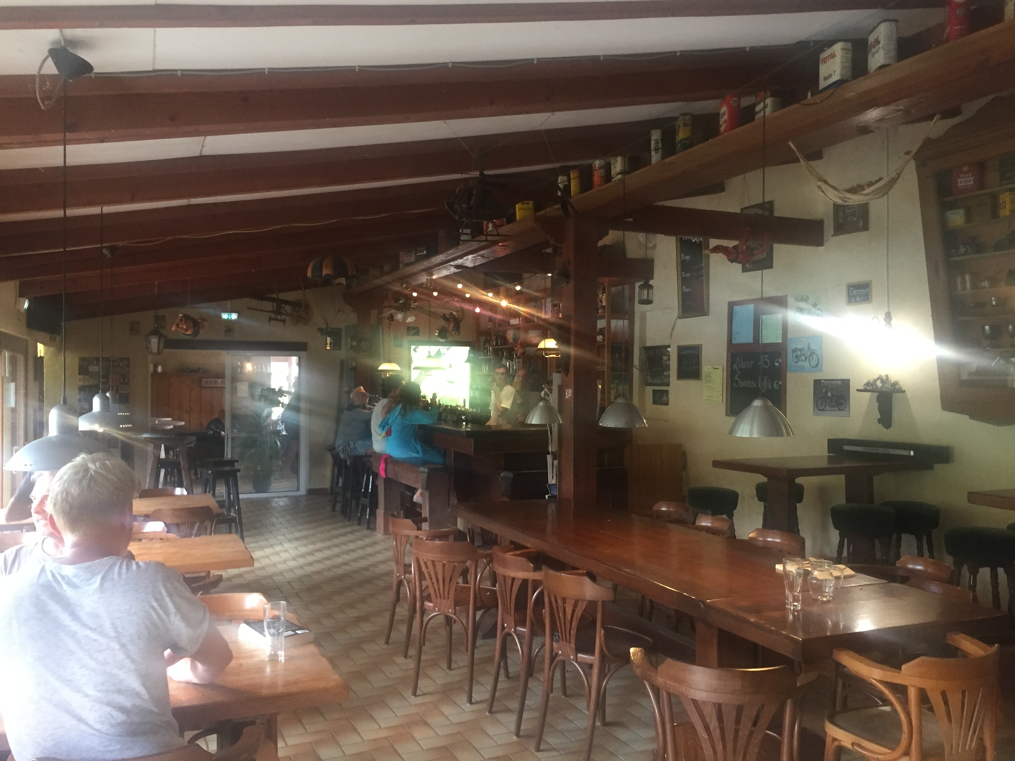 Cadre sympa, accueil correct, on retiendra une déco typiquement moto. A dispo, magazine, livres, baby foot payant, billard payant. Ce qu'on peut noter, c'est la forte concentrations de clients Hollandais (car c'est un camping Hollandais à la base), avec qui, la barrière de la langue crée un communautarisme naturel. De plus, la nourriture du resto est particulièrement chère pour une qualité toute relative... Ex : Pizza surgelée à 13€ : bof bof... L'avantage c'est que des road book sont à dispo pour planifier les journées moto. Et en prendre plein les yeux.
