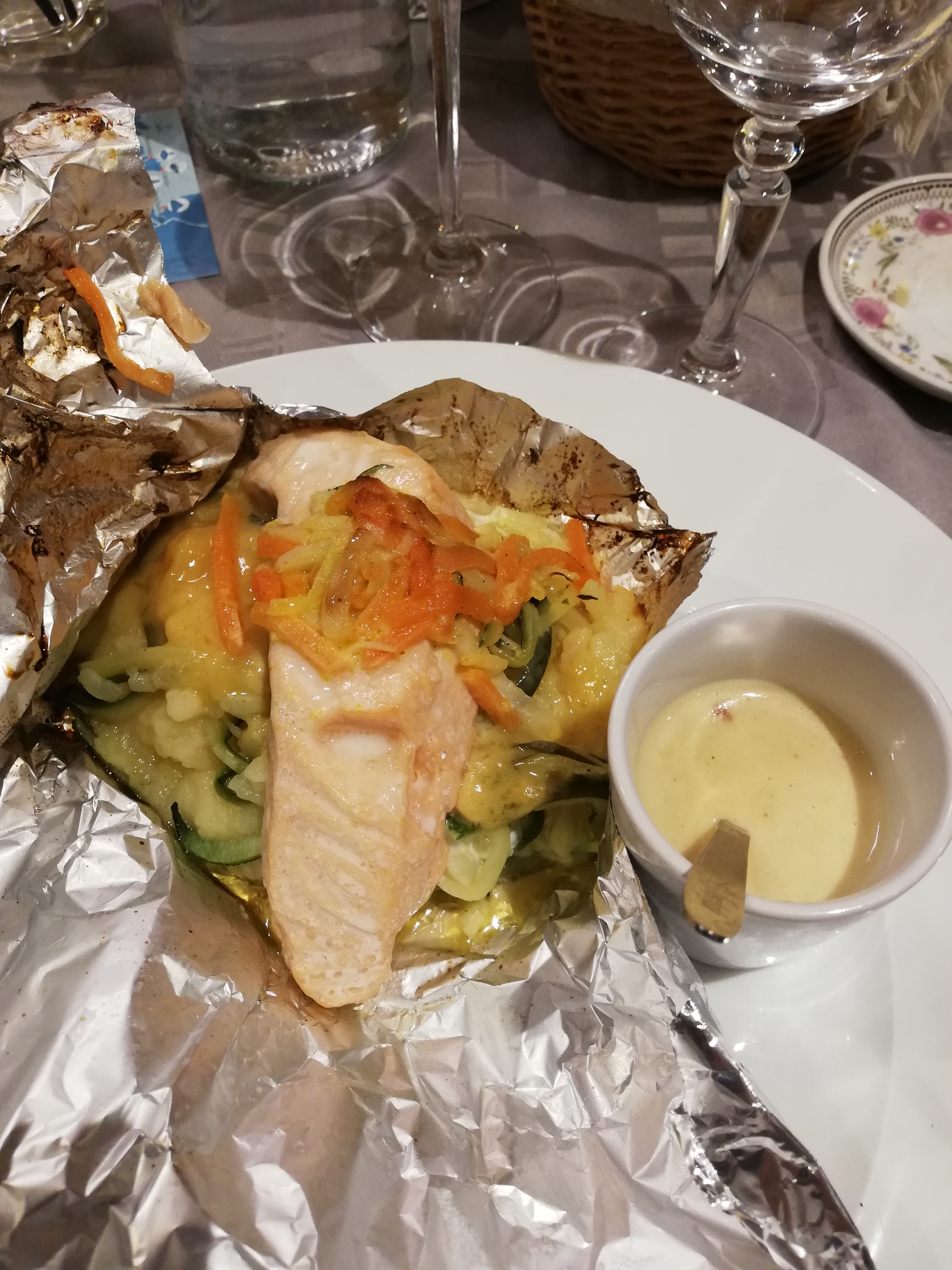 Le tartare de saumon à la mangue sur fond de guacamole était succulent (pour ceux qui aiment la cuisine salée sucrée), le repas s'est poursuivi avec un très bon filet de merlu et ces petits légumes poêlés. Je me suis surpris à aimer les brocolis.